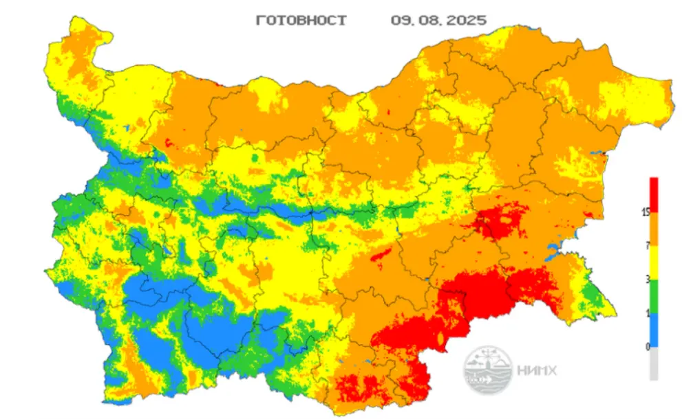 Задава се опасност от пожари през уикенда. На 9 и 10 август части от страната са оцветени в червено, което означава, че има опасност от много силни пожари, предупредиха от НИМХ.