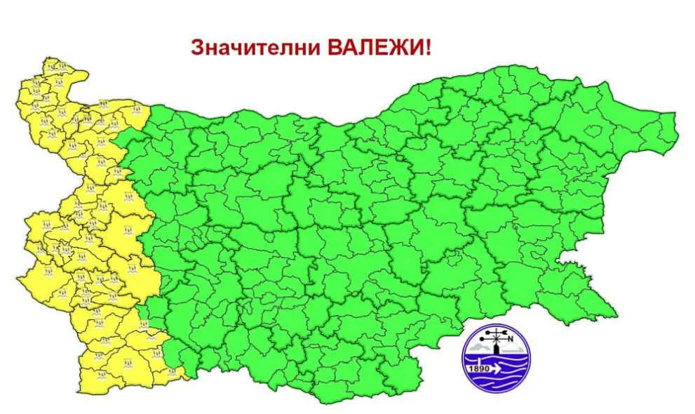 През деня ще бъде предимно облачно с валежи от дъжд. На места в Западна България количествата ще са значителни, обявен е жълт код. Предупреждението е в сила за 7 области - Видин, Монтана, София област, София град, Перник, Кюстендил и Благоевград.