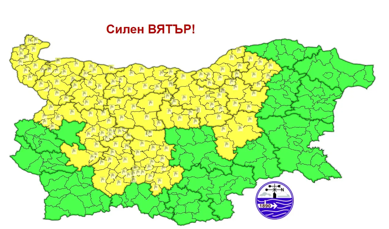 Жълт код за силен вятър е обявен за неделя в 14 области на страната. Предупреждението е в сила за София област, Видин, Монтана, Враца, Плевен, Велико Търново, Русе, Разград, Ловеч, Габрово, Търговище, Сливен, Пловдив, Пазарджик.