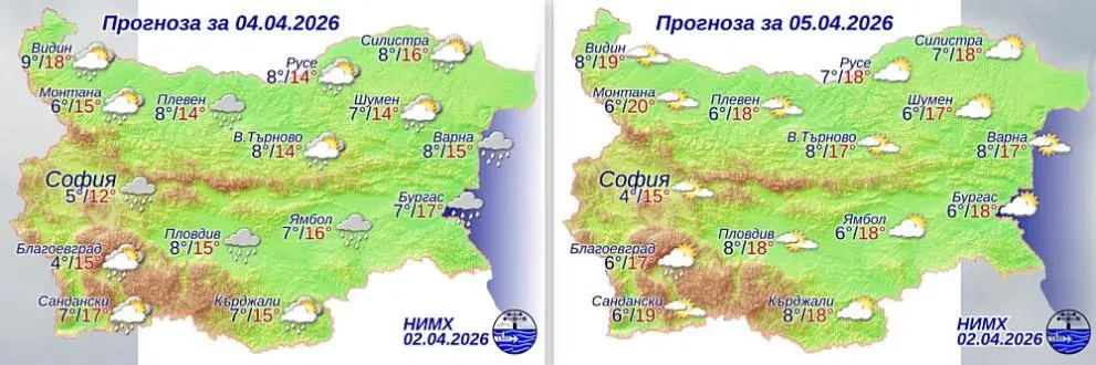 В събота ще се задържи предимно облачно, на места с краткотрайни валежи. Вятърът ще се ориентира от северозапад, в Източна България от североизток и отново ще е до умерен. Дневните температури ще се повишат и максималните ще са между 12° и 17°.