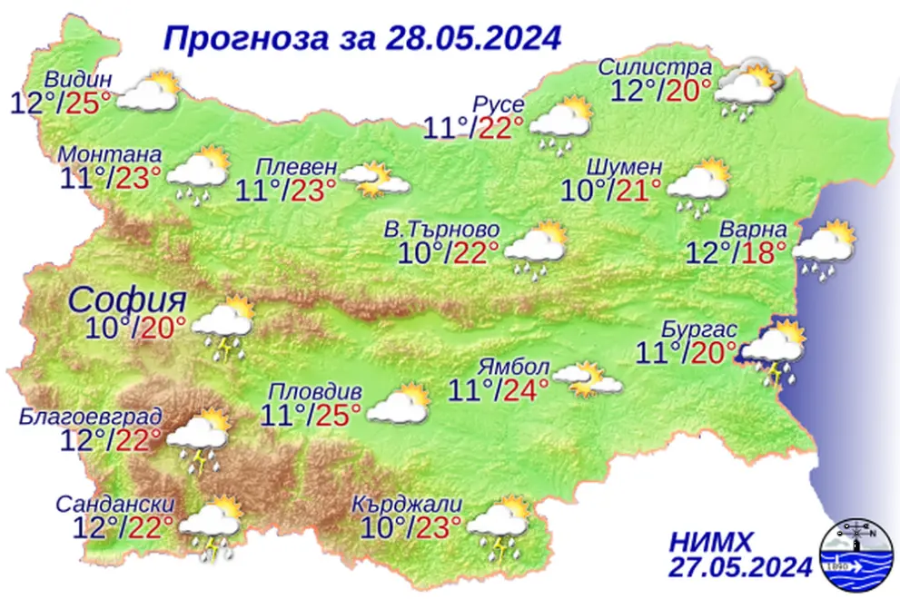 През следващите два дни въздушната маса над страната ще бъде силно неустойчива. Сутрин ще е почти тихо, ще има и слънчеви часове, но около и след обяд на много места в страната ще бъде с краткотрайни валежи и гръмотевици; има условия за локални интензивни явления и градушки. Вятърът ще бъде предимно слаб, в сряда – от запад-северозапад, в четвъртък – от запад-югозапад; по време на гръмотевична буря временно ще се усилва и ще променя посоката си. Максималните температури в сряда ще бъдат предимно между 21° и 26°, от четвъртък ще започне затопляне.