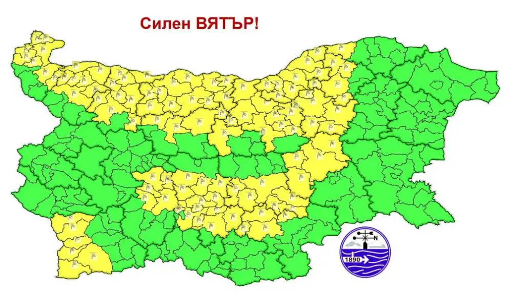 Синиптоците обявяват жълт код за потенциално опасно време и силен вятър в част от страната. Кодът е в сила за 17 области - Видин, Монтана, Враца, Плевен, Ловеч, Габрово, Велико Търново, Русе, Търговище, Силистра, Разград, Сливен, Стара Загора, Хасково, Пловдив, Пазарджик и Благоевград.