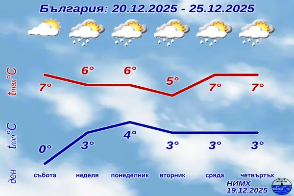 В събота отново на много места ще има мъгла. В следобедните часове от югоизток облачността ще се увеличи и в неделя и през първите дни от новата седмица ще бъде предимно облачно. Ще има и валежи, предимно от дъжд, на повече места и повече по количество в понеделник. В планините ще вали сняг, повече в Централна Стара планина и в Родопите. Вятърът ще е от източната четвърт, слаб, в източната половина от страната до умерен. Минималните температури в събота ще са около нулата, през следващите дни слабо ще се повишат и най-често ще са от минус 2°-0° в югозападните райони до 6°-7° в крайните източни. Дневните отначало постепенно ще се понижават и във вторник ще са между 3° и 8°; към средата на седмицата слабо ще се повишат и в югоизточните райони ще достигат 10°-11°.