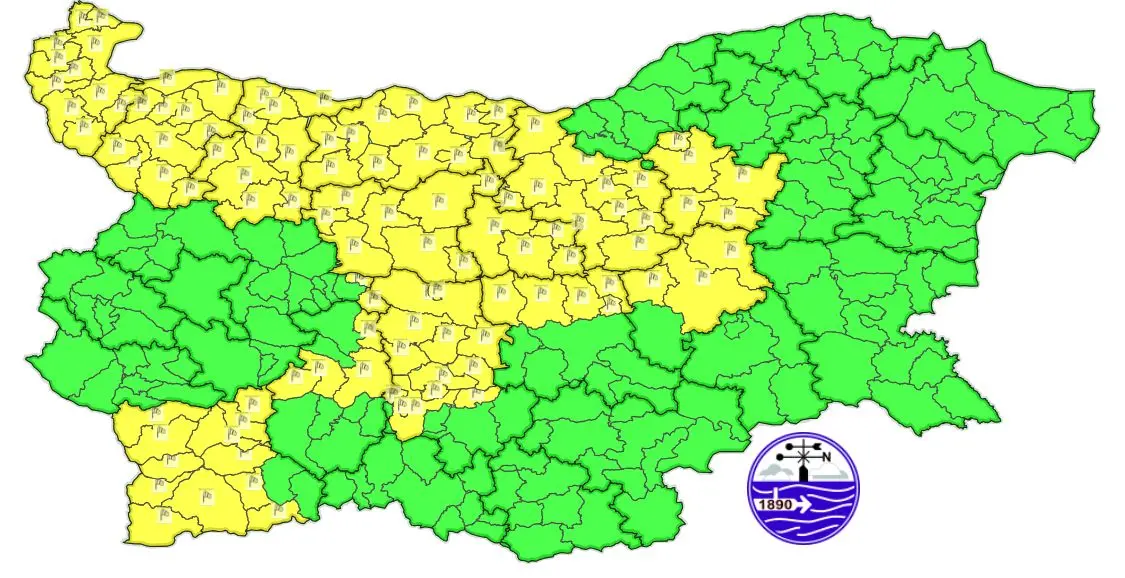 Предупредителният код за потенциално опасно време важи за областите Благоевград, Велико Търново, Видин, Враца, Габрово, Ловеч, Монтана, Пазарджик, Плевен, Пловдив, Сливен, София област, Стара Загора и Търговище.