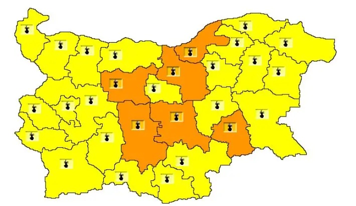 За шест области в Централна България е обявен оранжев код за опасни горещини, а във всички останали части от страната е в сила жълт код.