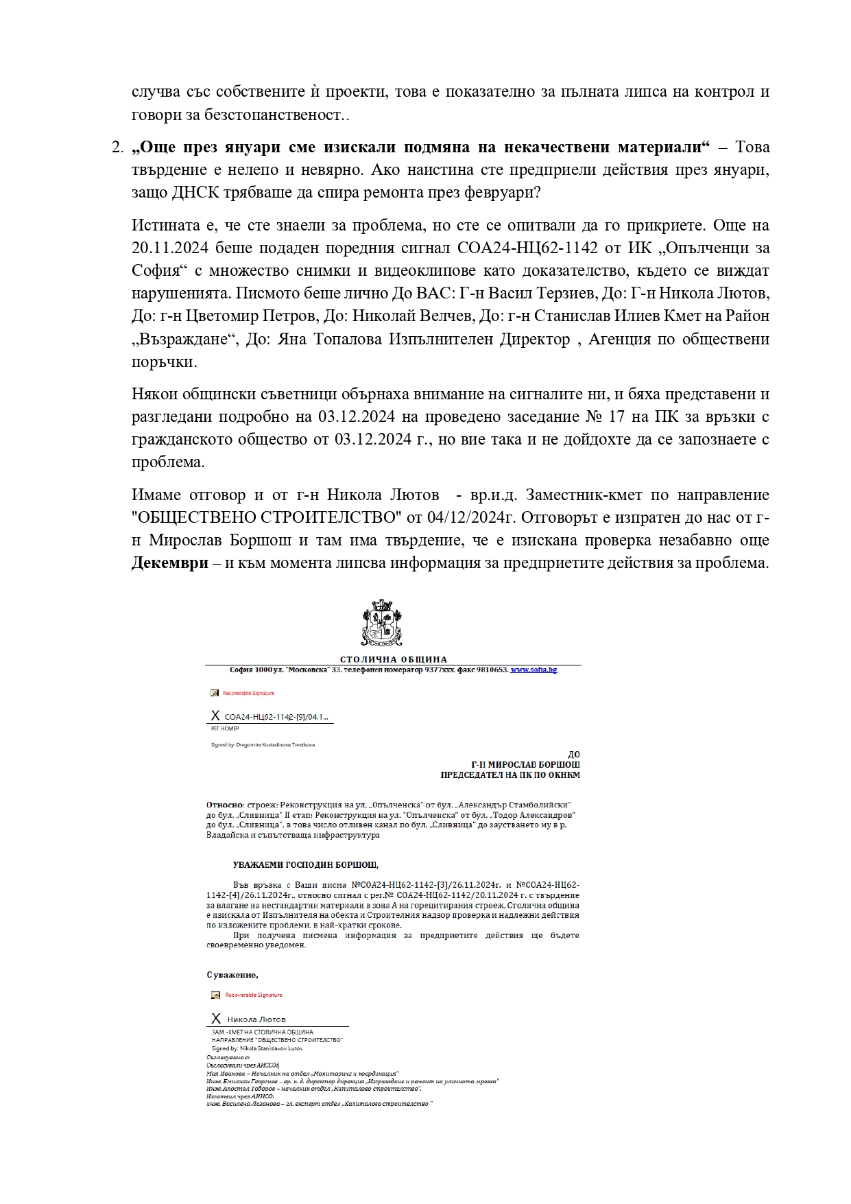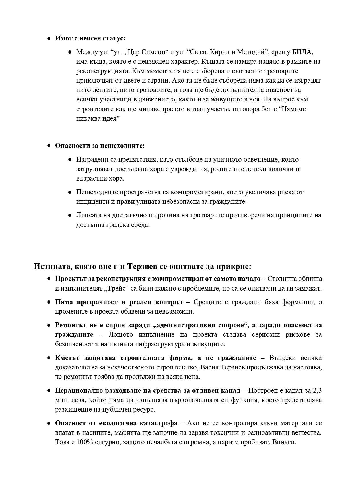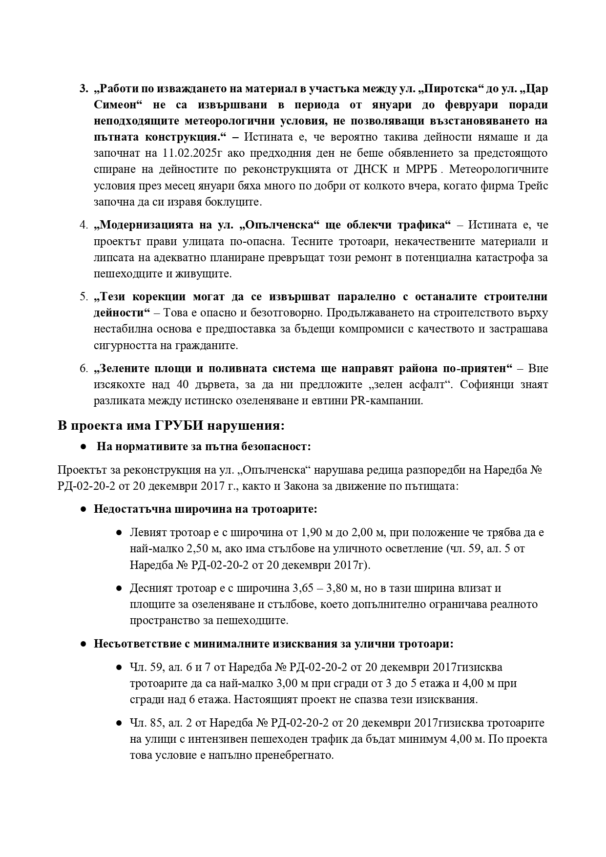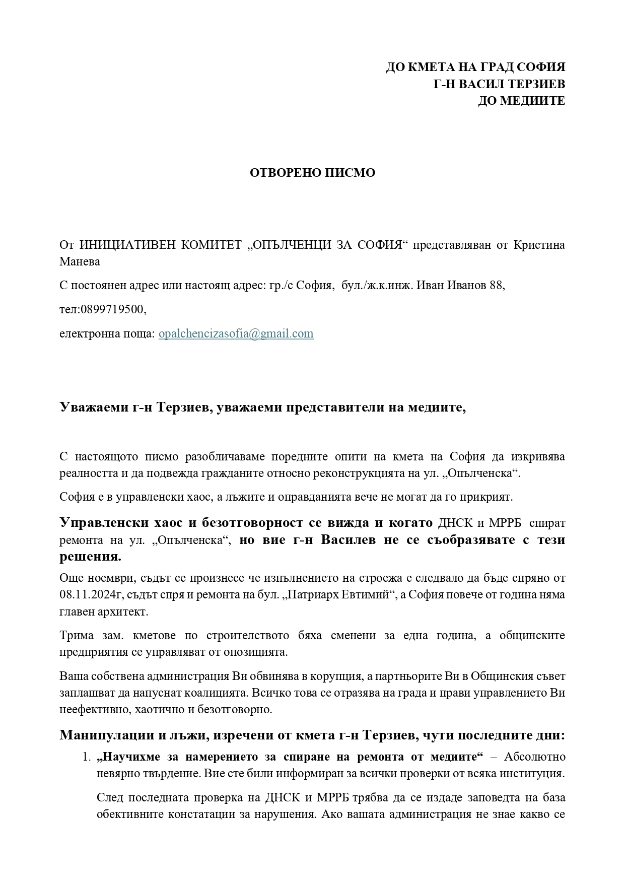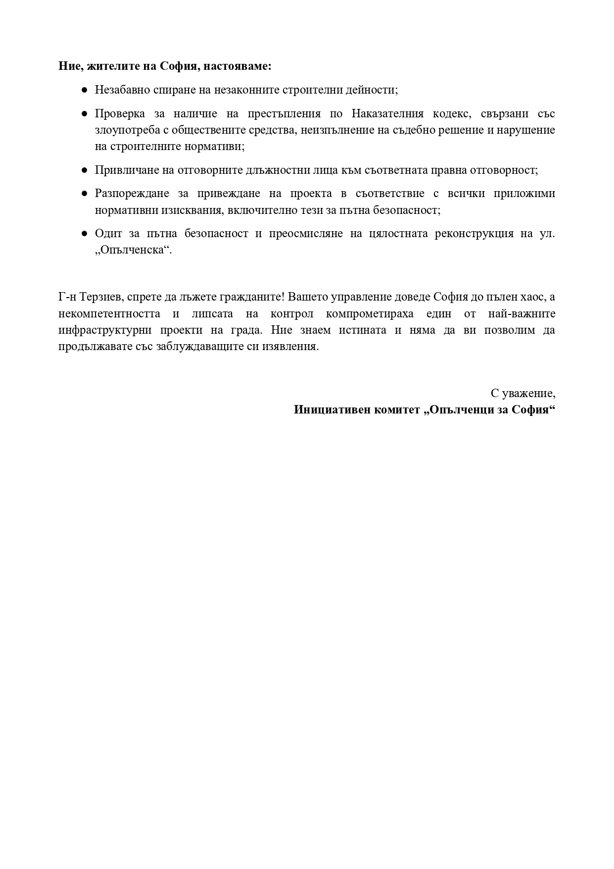 „С настоящото писмо ние изразяваме гласното си несъгласие с позицията на г-н Терзиев относно реконструкцията на ул. Опълченска и изобличаваме лъжите, който разпространява той и екипът му в публичното пространство. Надявахме се, че обръщайки се директно многократно към г-н Васил Терзиев ще бъдат предприети необходимите действия за спазване на законите и подзаконовите нормативни актове на Република България, но това така и не се случва. За съжаление смятаме, че за пореден път на ул. Опълченска ще се извършат нарушения и няма да се прекратят ремонтните дейности дори и след констатирани несъответствия от ДНСК и МРРБ. Ние изискваме разширението на улицата да отговаря на всички стандарти на сигурност за пешеходците. Неосигуряването на пътна безопасност, за всички жители и гости на град София, за всички пешеходци и за над 4 000 деца учащи в четири училища, в непосредствена близост до ул. „Опълченска“, които ежедневно се движат по нейните тротоари ще тежи на вашата съвест“, пишат те.