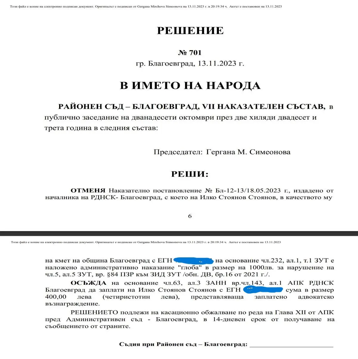 След протеста, Административен съд отмени разпореждането на ДНСК и залите започнаха да се ползват отново от децата на Благоевград. Само че проверките на ДНСК спрямо мен продължиха и ми бяха издадени пет наказателни постановления, с които бях лично глобен.