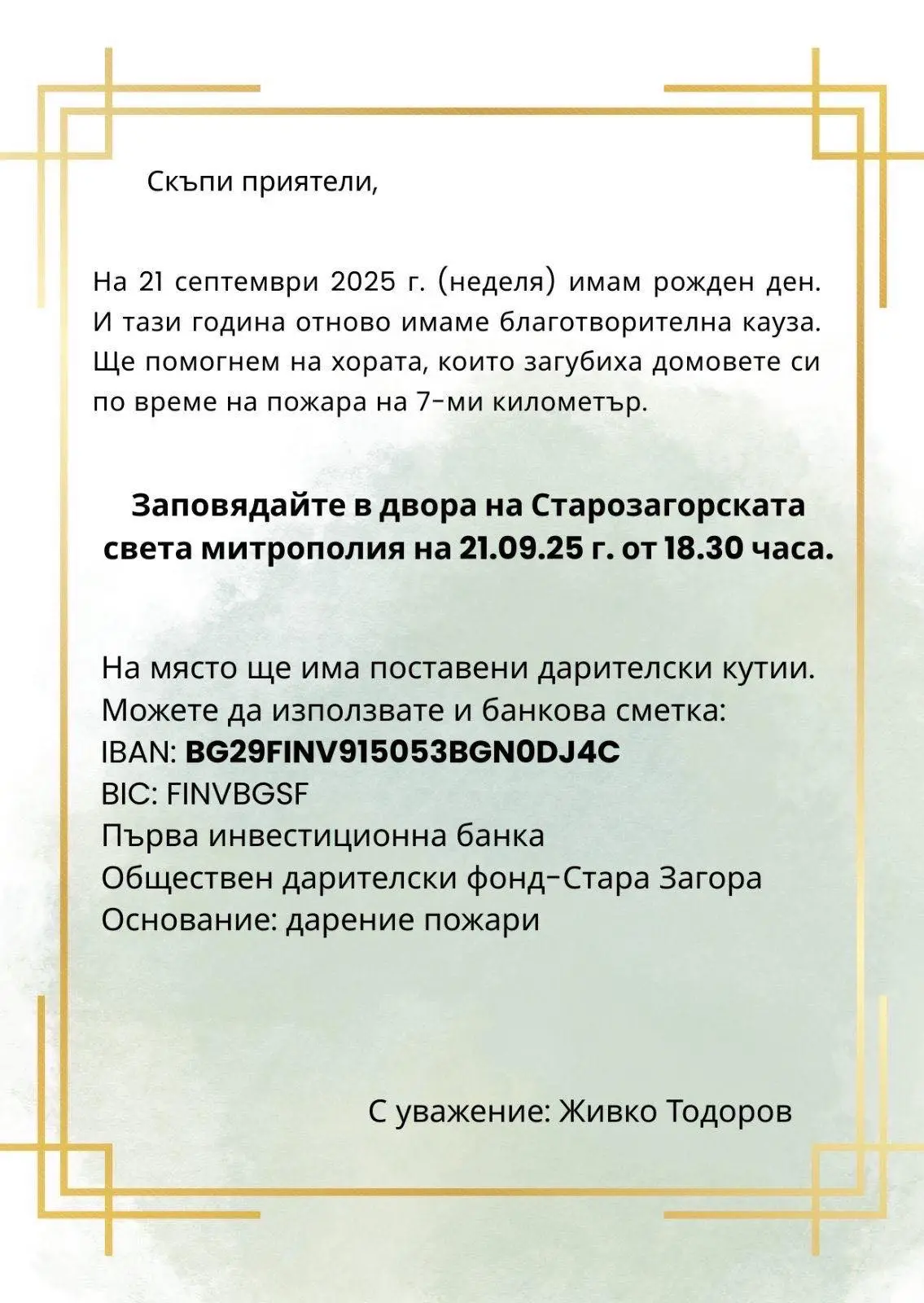 „Всяка година правя благотворителна инициатива за рождения си ден. Тази година каузата е да помогнем на хората, които загубиха домовете си в пожара на “Седми километър”. Всеки, който иска да помогне, е добре дошъл“, обяви Тодоров в профила си във Фейсбук.