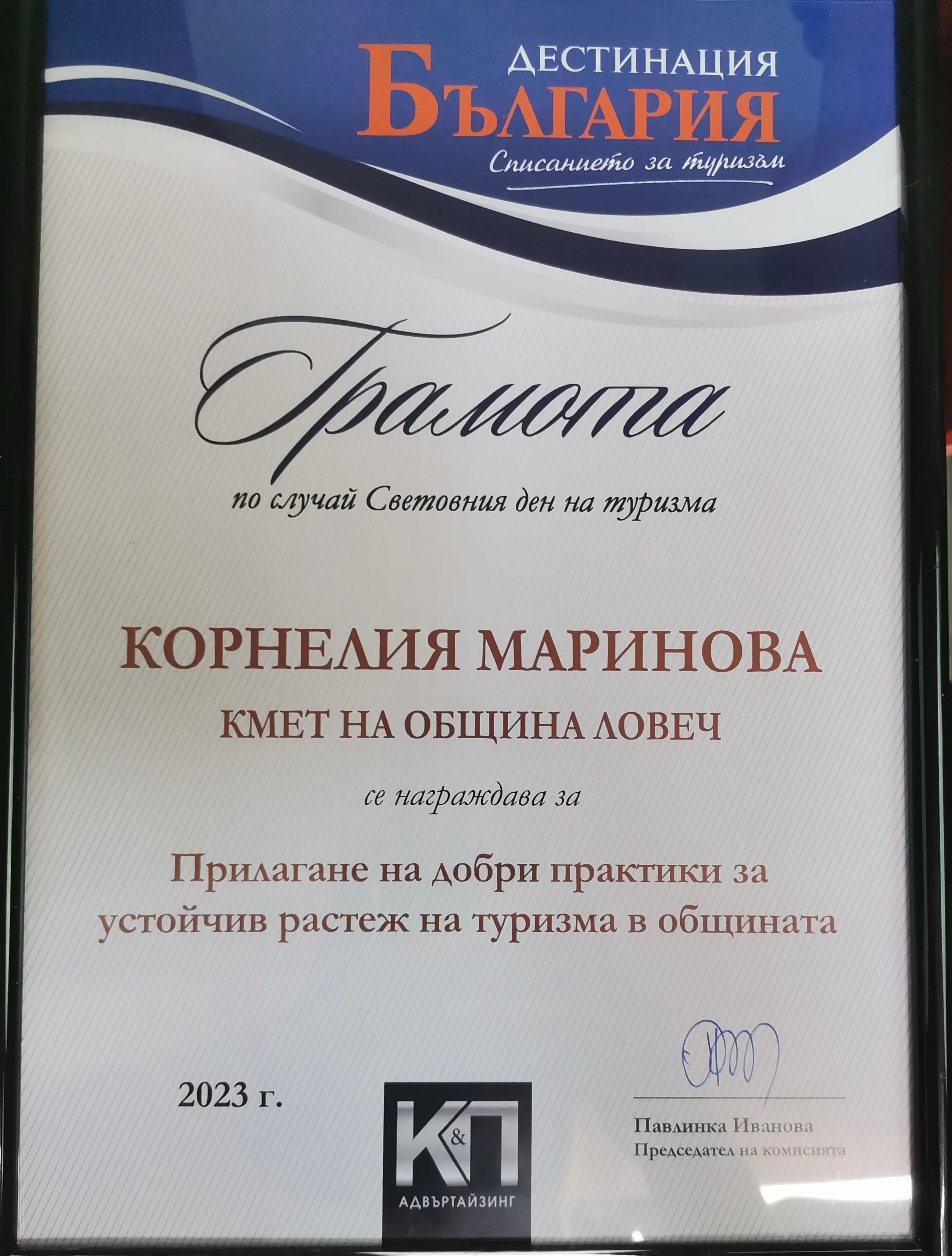Кметът на Община Ловеч Корнелия Маринова бе отличена с грамота на списание „Дестинация България“ с мотив „За прилагане на добри практики за устойчив растеж на туризма в общината“ .