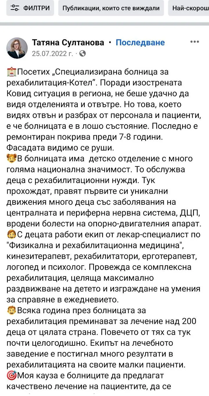 „А преди време депутатката от ПП Татяна Султанова, каза, че ще работи за намиране на финансиране на болницата в Котел, за подобряване на инфраструктурата й, енергийната ефективност и апаратурата.