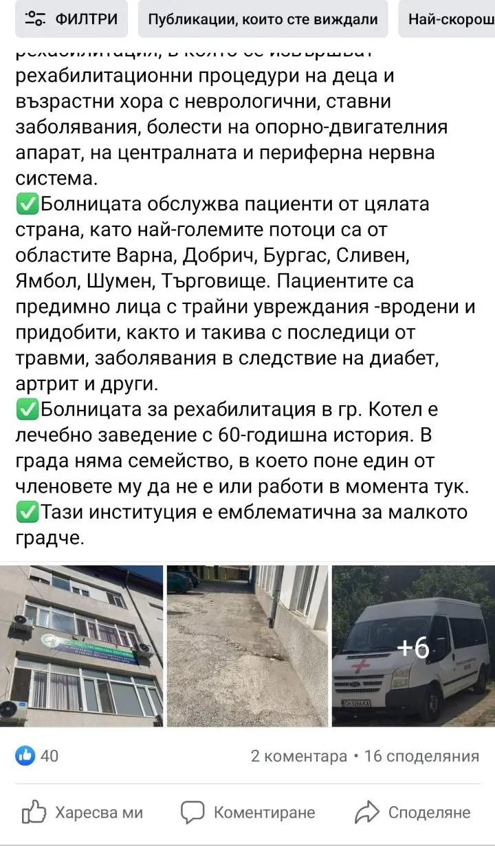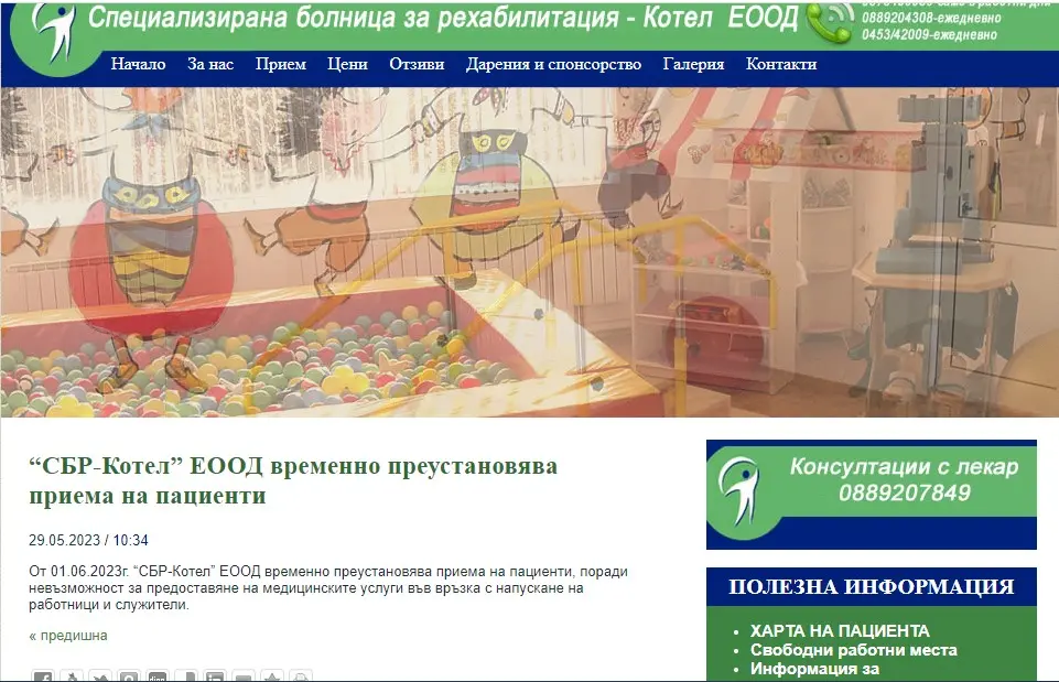От 1 юни Специализираната болница за рехабилитация в Котел затваря, става ясно от сайта на лечебното заведение. Майки от цялата страна, чиито деца са с детска целебрална парализа/ДЦП/ и аутизъм, и са проходили след рехабилитация тук, споделят за случаи, в които детското отделение стои празно, но от болницата отказват прием на пациенти. В резултат за две години лечебното заведение със 70 годишна история трупа финансови загуби и спира работа.