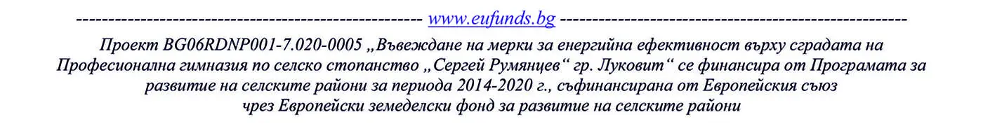 Дейностите са изпълнени по проект BG06RDNP001-7.020-0005 „Въвеждане на мерки за енергийна ефективност върху сградата на Професионална гимназия по селско стопанство „Сергей Румянцев“ гр. Луковит“, с Административен договор BG06RDNP001-7.020-0005-С01 от 28.12.2023 г. и с бенефициент Община Луковит.