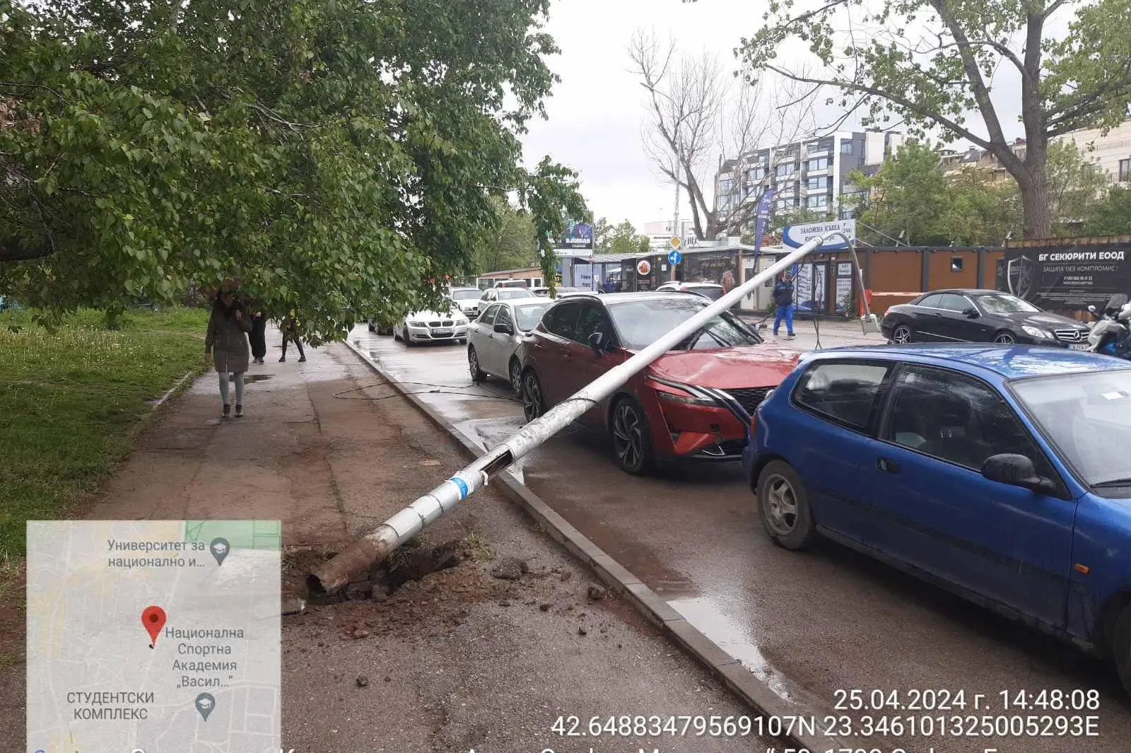 Кранът е закачил въздушно разположени кабели, което е довело до събаряне на стълб на улично осветление. Стълбът се е стоварил върху паркиран автомобил.