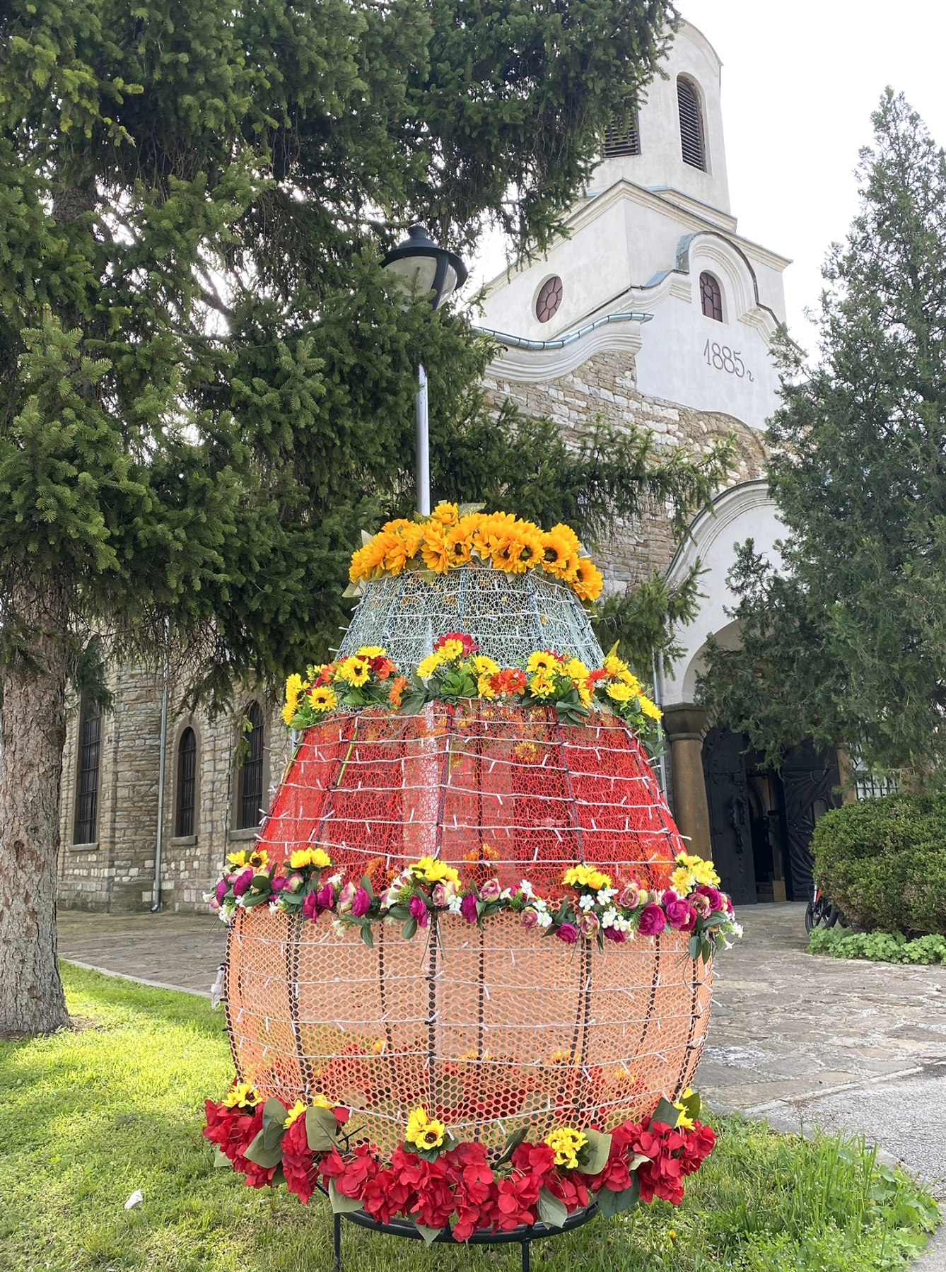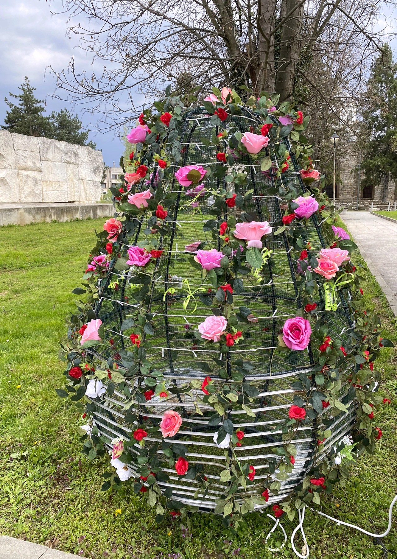 Богатата на форми и багри украса се откроява на фона на разцъфналите теменужки и свежа зеленина, а във вечерните часове се облива в светлини.