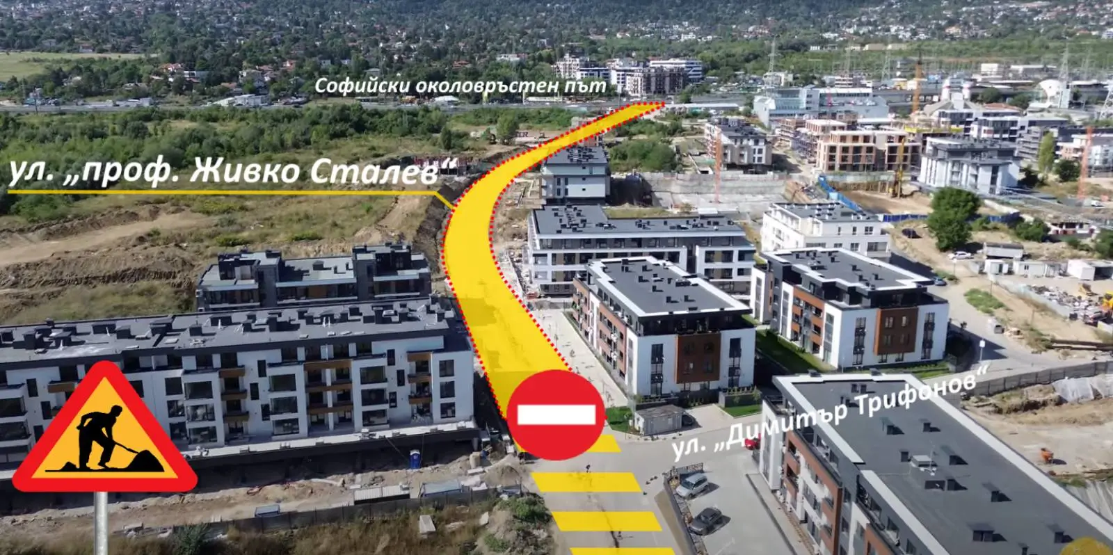- По ул. „проф. Живко Сталев“ се ограничава движението от ул. „Димитър Трифонов“ до локалното платно на Софийския околовръстен път. Предвидени са общо 4 етапа на организация на движението, които ще бъдат въвеждани последователно. За тях ще бъде публикувана своевременно информация.
