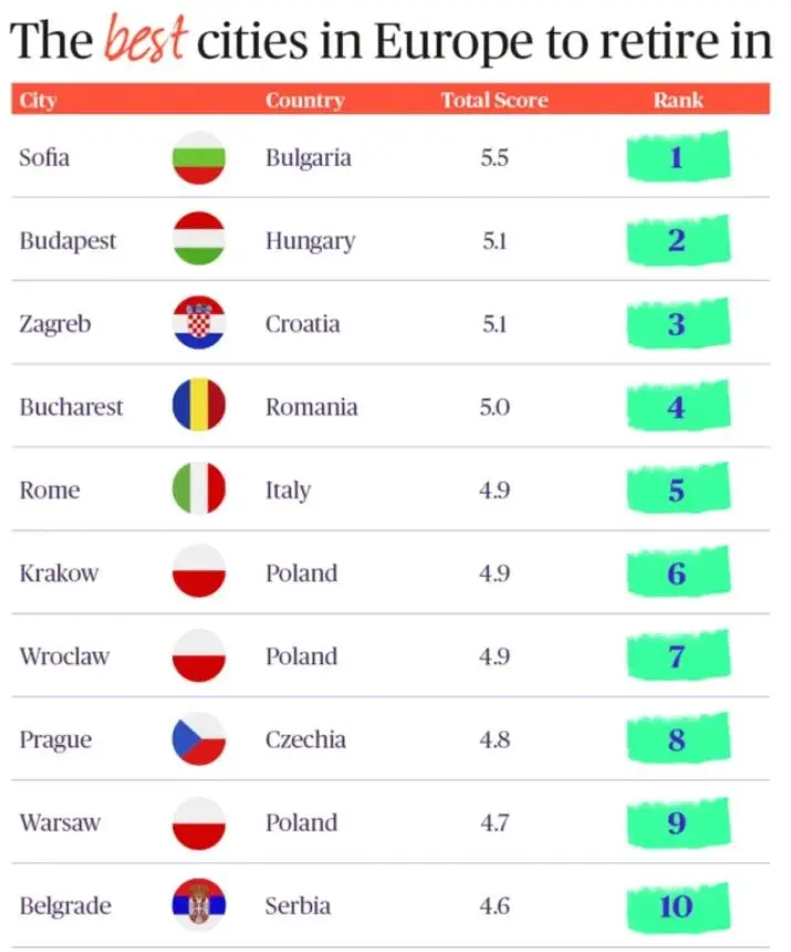 "Столицата на България - София е с индекс на разходите за живот 41,2 и общ резултат 5,5. Това се дължи на среден наем от 322,36 паунда и комунални услуги от 108,27 паунда на месец, което означава, че вашите минимални пенсионни спестявания трябва да бъдат само 126 301 паунда (най-ниското в класациите за Обединеното кралство и ЕС).