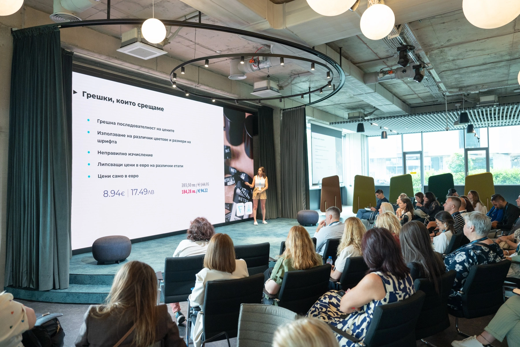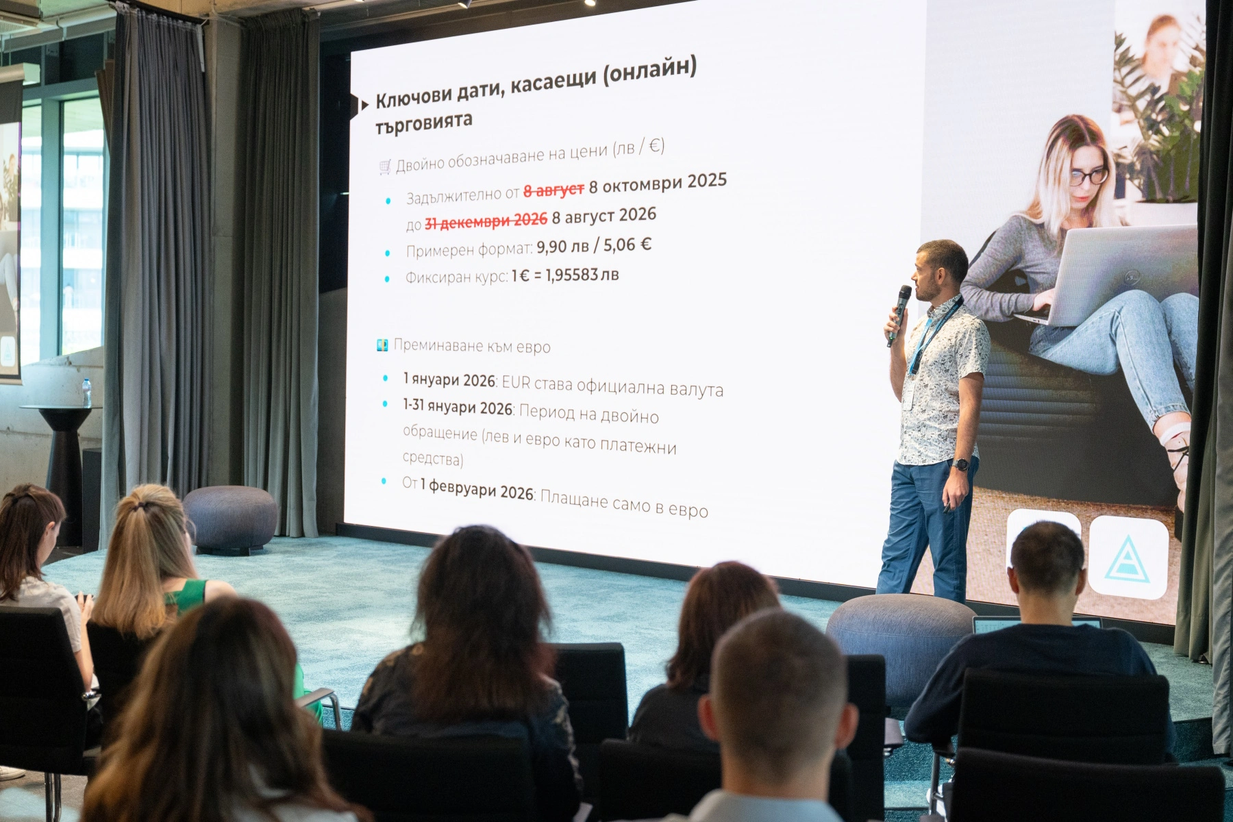 Добромир Генов, Team Lead в PPC екипа на Netpeak, внесе конкретика относно дигиталната реклама. От 8 октомври 2025 г. (краят на гратисния период) всички реклами във Facebook, Google, TikTok и други платформи трябва да включват цени и в лева, и в евро – не само в текста, но и във всички банери, видеа и автоматизирани фийдове. Това поставя предизвикателства, тъй като Google Ads например не позволява две валути в стандартните полета.