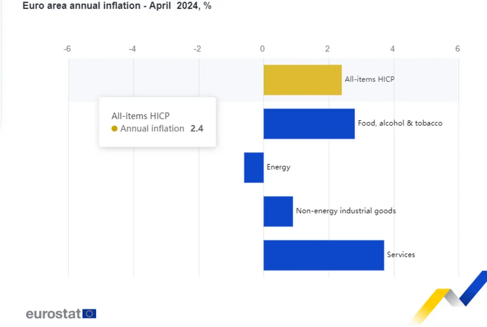 Годишната инфлация в еврозоната остава стабилна през април спрямо март на равнище от 2,4 на сто, се посочва в предварителната оценка на Евростат.