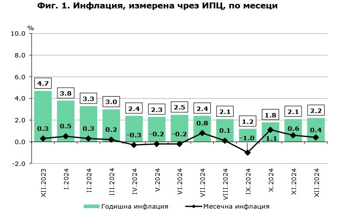 Месечната инфлация е 0.4%, а годишната инфлация е 2.2%, това показват данните на Националния статически институт за месец декември, пише сайтът financialtribune.bg.