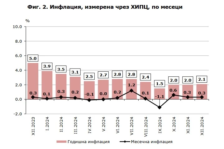 Инфлацията от началото на годината (декември 2024 г. спрямо декември 2023 г.) е 2.1%, а средногодишната инфлация за периода януари 2024 - декември 2024 г. спрямо периода януари 2023 - декември 2023 г. е 2.6%