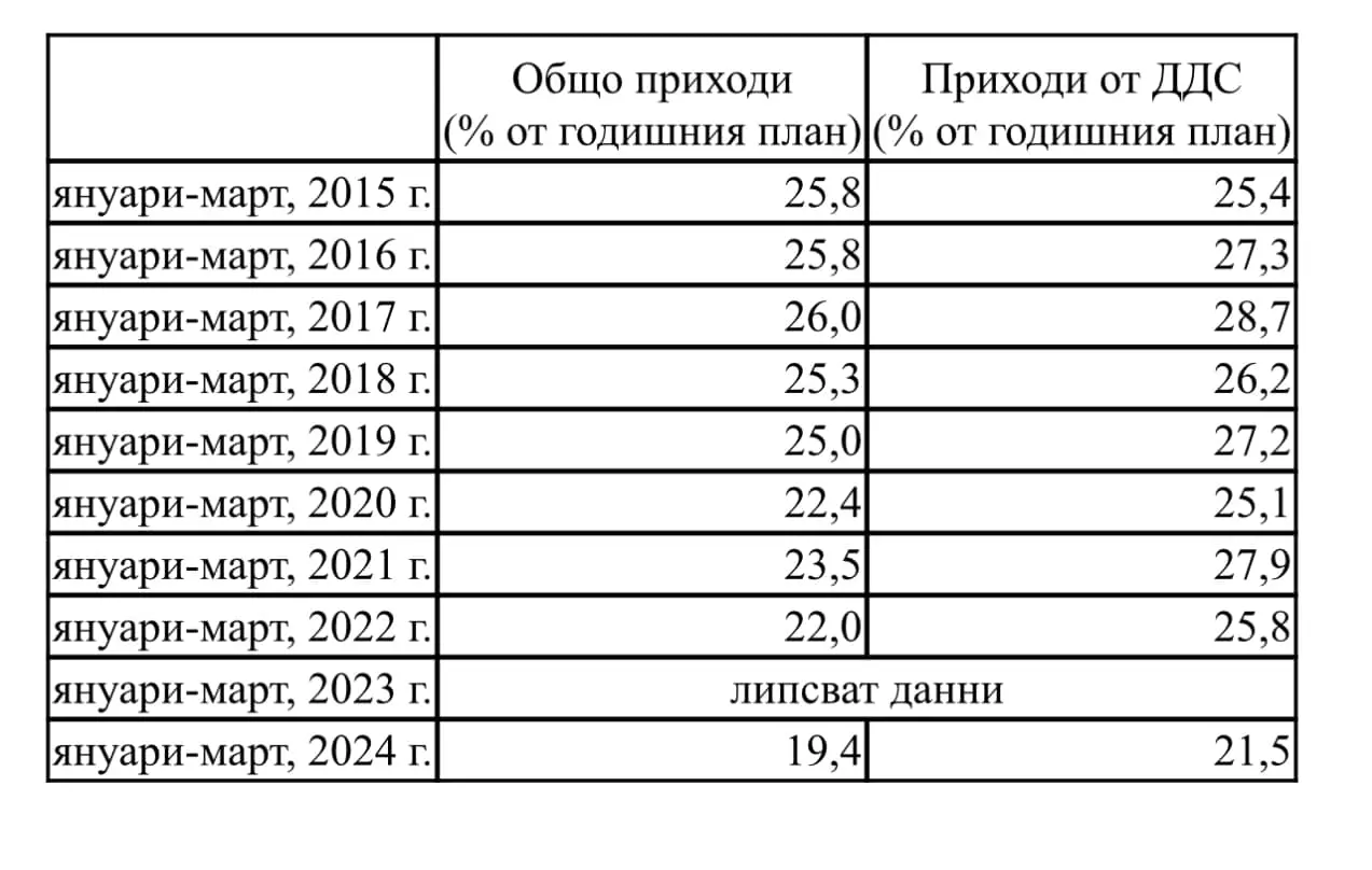 „Толкова средно се е събирало за първите три месеца през предходните години. Такъв трябва и да е процентът, за да няма неизпълнение в края на годината. Дори в КОВИД-ната 2020 г. изпълнението за първите 3 месеца е било по-високо – 22,4 процента. Аналогична е ситуацията с приходите от ДДС. Изпълнението на годишния план е едва 21,5 процента. Средногодишно през първите три месеца предходни години са се събирали 27% (всяко година януари месец приходите от ДДС са по-високи, заради по-високо потребление през декември)“, пояснява той.
