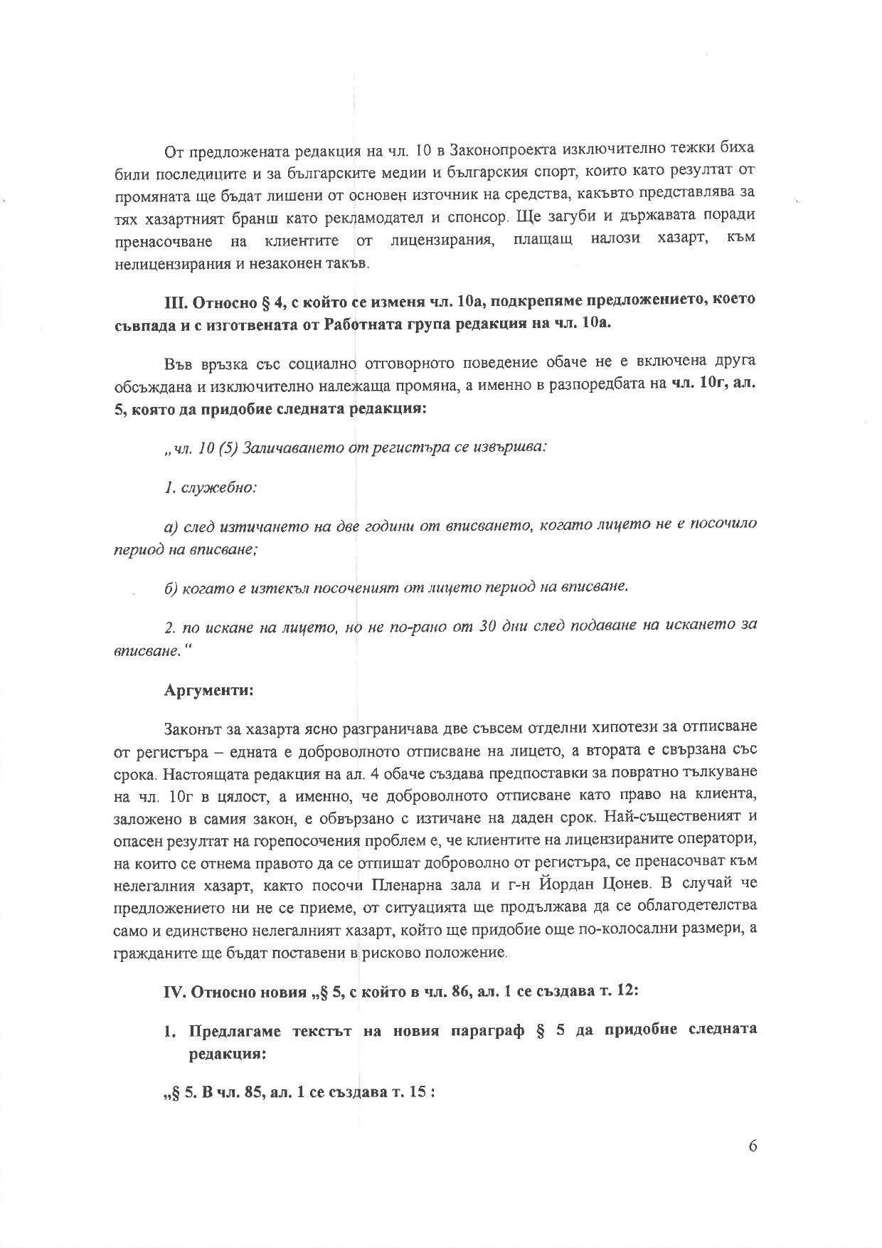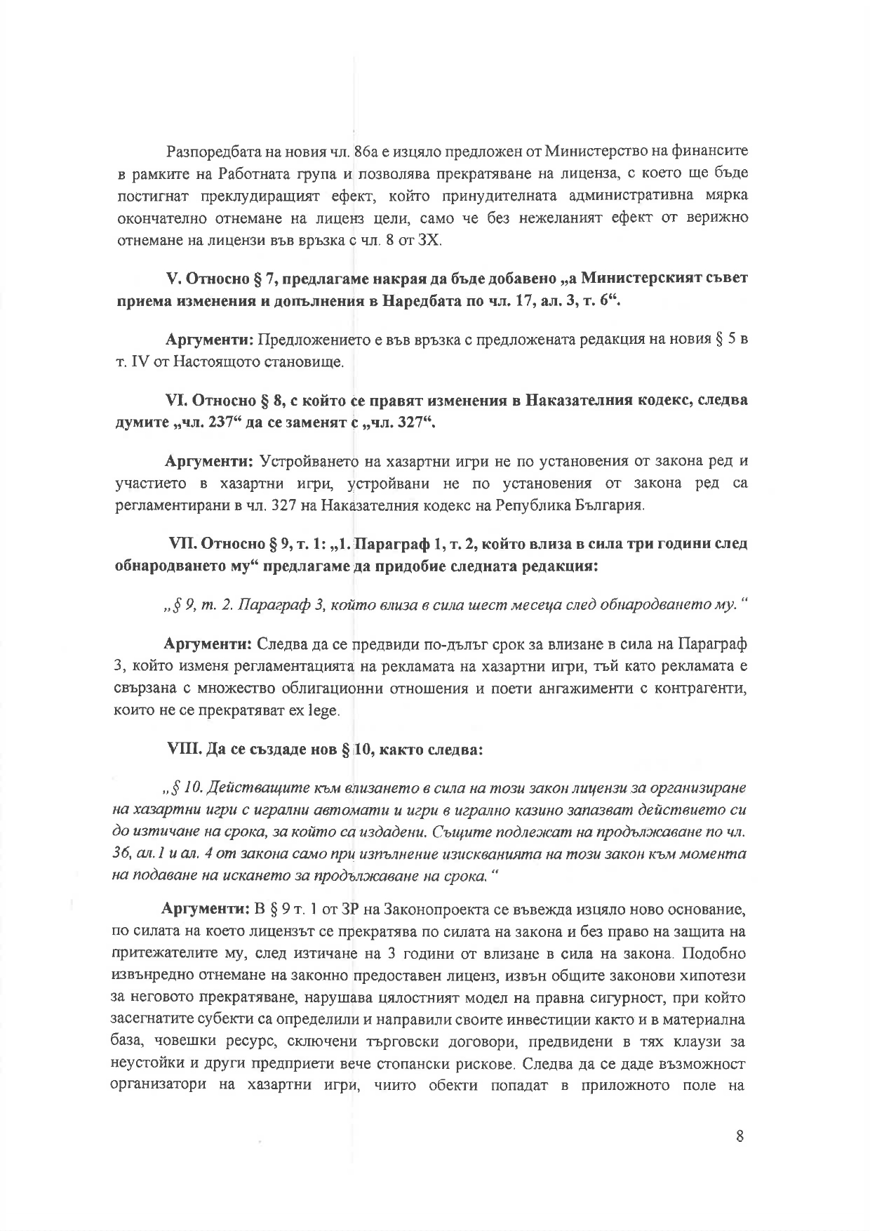 В него, лицензираните хазартни компании заявяват, че очакват предложените промени в Закона за хазарта да имат трайни негативни последици върху приходите в държавния бюджет, върху самите лицензирани организатори на хазартни игри и производители на игрално оборудване, върху инвестициите и заетостта в сектора, както и за българския спорт, медиите и обществото като цяло.