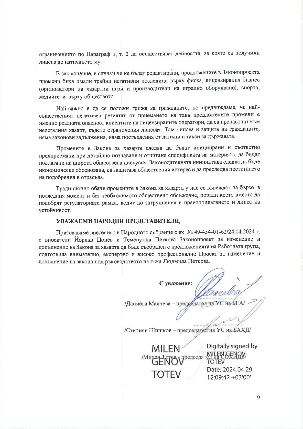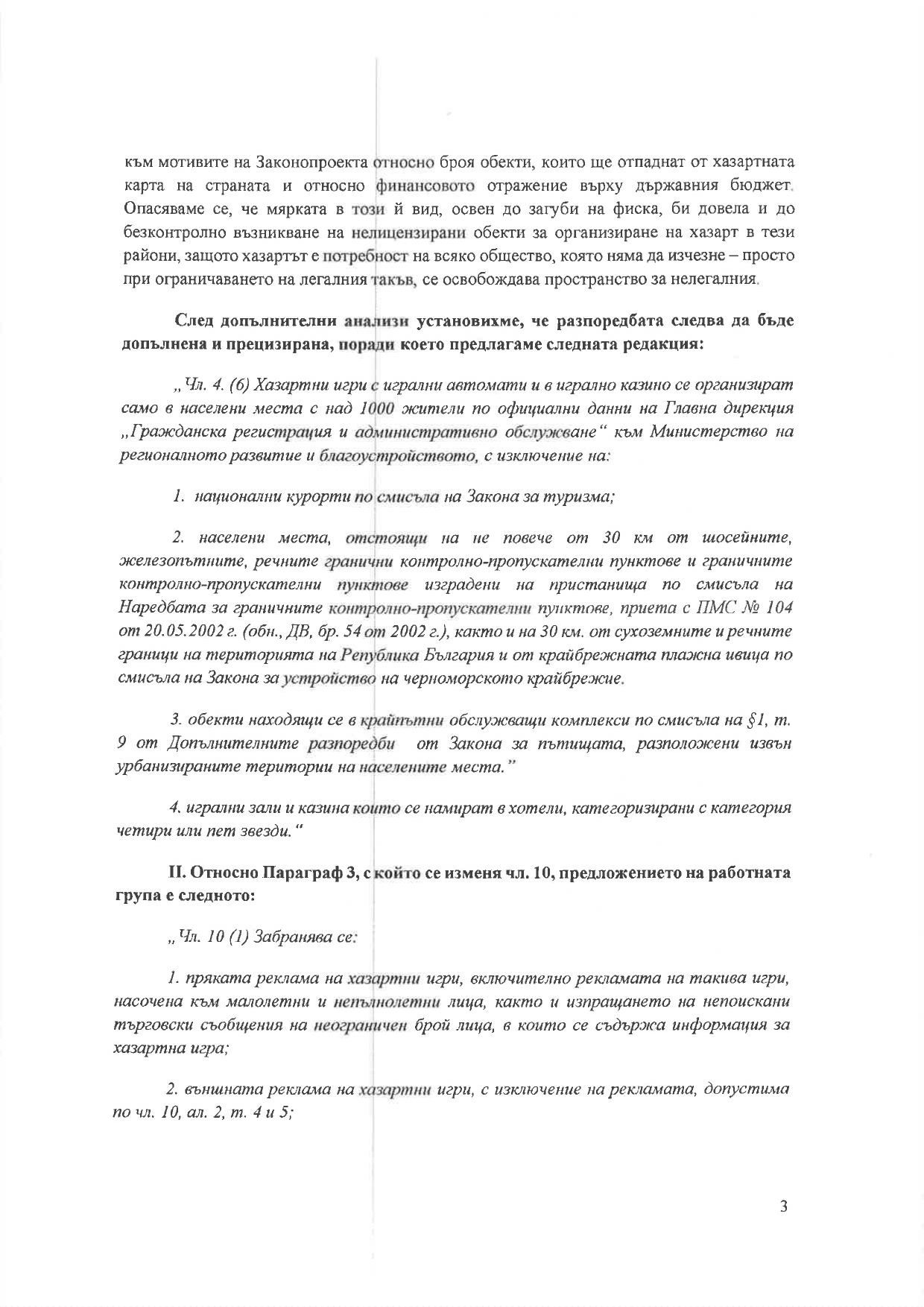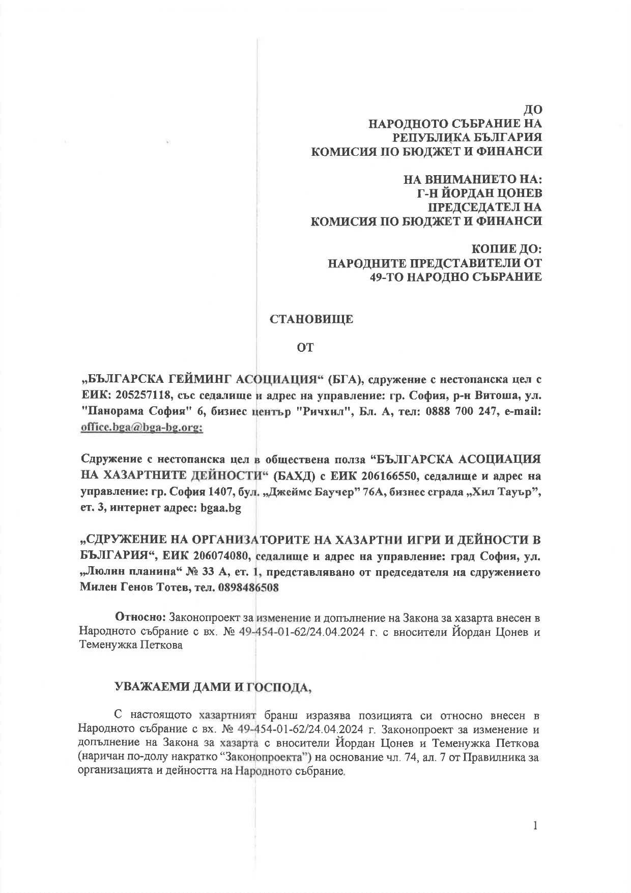 Във връзка с предложените промени „БЪЛГАРСКАТА ГЕЙМИНГ АСОЦИАЦИЯ“ (БГА), “БЪЛГАРСКА АСОЦИАЦИЯ НА ХАЗАРТНИТЕ ДЕЙНОСТИ“ (БАХД) и „СДРУЖЕНИЕТО НА ОРГАНИЗАТОРИТЕ НА ХАЗАРТНИ ИГРИ И ДЕЙНОСТИ В БЪЛГАРИЯ“, които обединяват десетки компании, опериращи в сферата на хазарта и притежаващи законно издадени лицензи, излязоха с общо становище.