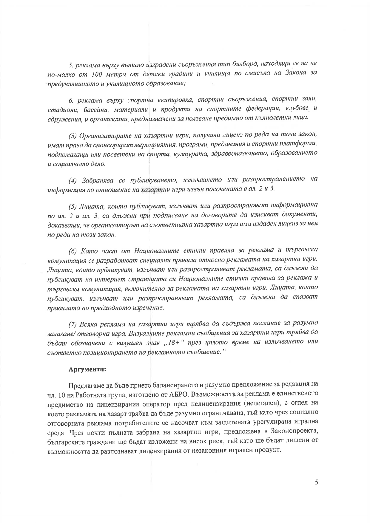 Компаниите в посочените асоциации и сдружения критикуват мярката за почти пълна забрана за реклама на хазартни игри и предложения като изтъкват, че „възможността за реклама е единственото предимство на лицензирания оператор пред нелицензирания (нелегалния), с оглед на което рекламата на хазарт трябва да бъде разумно ограничавана“. Така предложените ограничения ще доведат само до разрастване на нелегалния хазарт, до съществени загуби за държавния бюджет и ще изложи потребителите на ненужни рискове, произтичащи от залозите с нелицензирани и необвързани с българското законодателство сайтове и оператори.