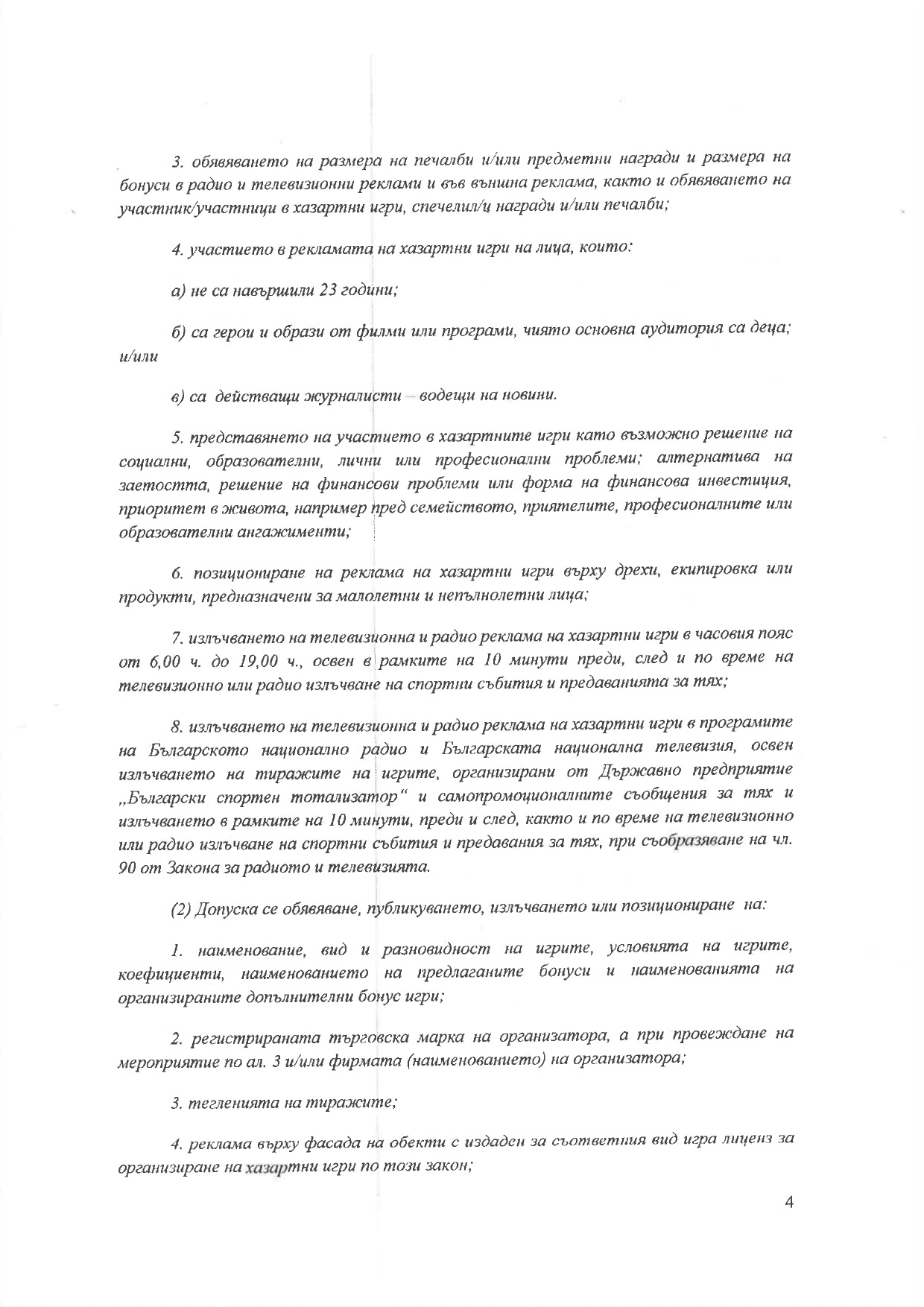 Предложените промени в Закона включват практически почти пълната забрана за реклама на хазарт в медиите и интернет, като на хазартните оператори бе оставена възможността да рекламират чрез билбордове, които са на не по-малко от 100 м от учебни заведения, както и на спортни съоръжения и на фланелките на спортистите, стига те да не се ползват от деца.