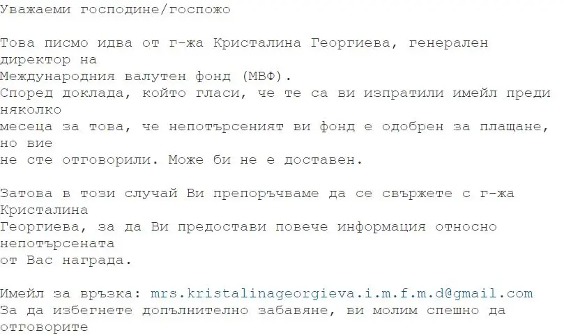 Опасни имейли се разпростаняват от името на Кристалина Георгиева. С големи букви „Внимание“ получателите се приканват да отворят съобщението. В него пък пише, че ако искате да получите „наградата“ си трябва да отговорите на посочения мейл.