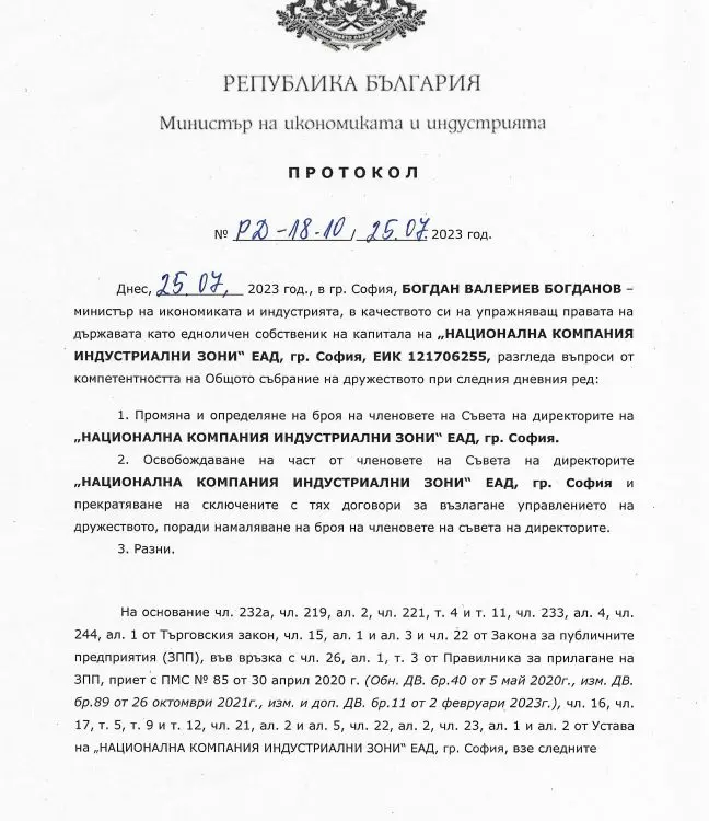Министърът на икономиката Богдан Богданов е един от първите, който започна рокадите в държавните фирми. От вчера Национална компания индустриални зони е с нов директор. На поста бе назначен близкият до Румен Радев, Константин Палеев, който сменя Антоанета Барес. Палеев оглавяваше дружеството след назначение по време на първото служебно правителство на Гълъб Донев.