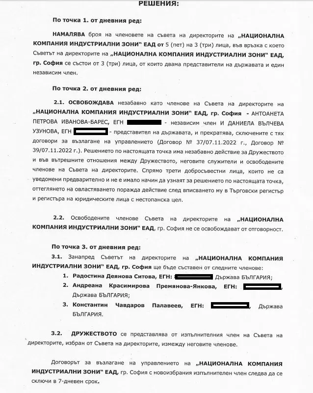 С решение на министър Богданов Съвета на директорите се намалява, като отпадат Антоанета Барес и Даниела Узунова. В дружеството остават Константин Палавеев, Радостина Ситова и Андреана Премянова-Янкова.