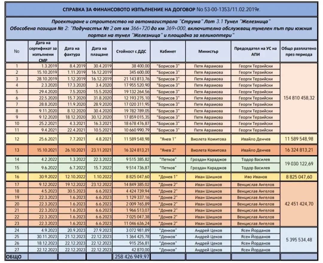 Министерство на регионалното развитие и благоустройството публикува пълна справка за всички плащания по реализацията на тунел „Железница“ на АМ „Струма“.