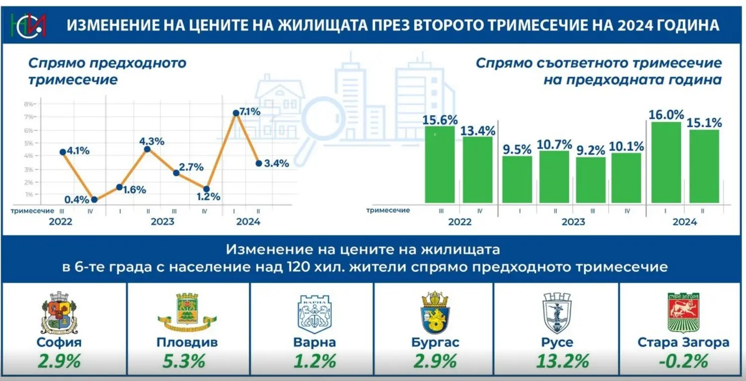 През второто тримесечие на 2024 г. цените на жилищата в страната са се увеличили с 15,1% в сравнение с второто тримесечие на 2023 година, след като първото тримесечие те се повишиха с 16% на годишна база, показват още данни на НСИ.