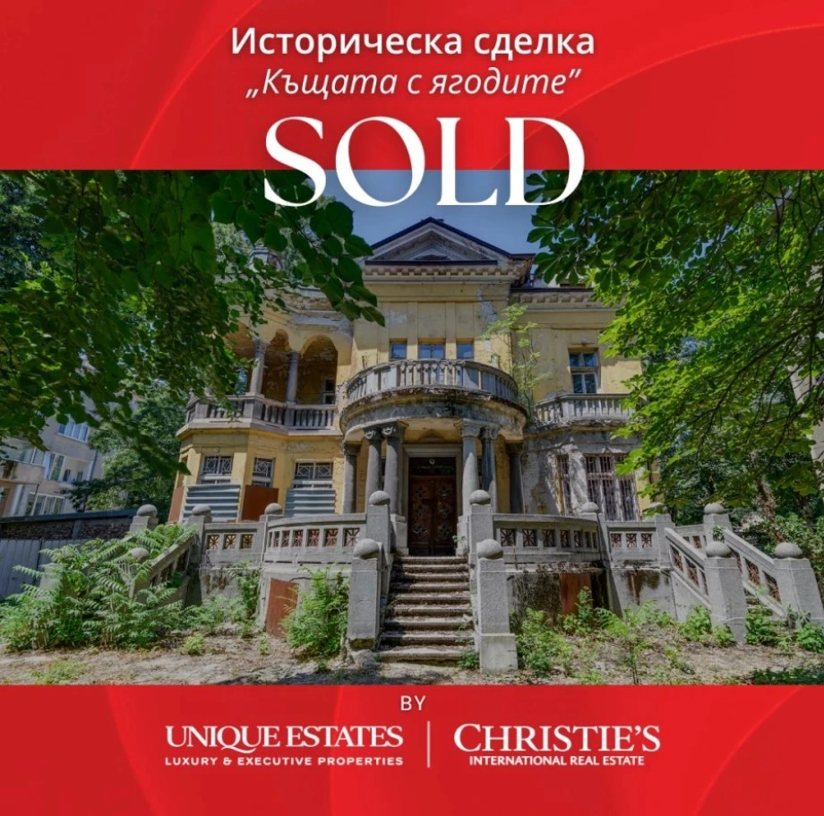 Продажбата на Къщата с ягодите на ул. „Сан Стефано“ 6 в София ще е най-значимата сделка за жилищен имот през 2024 г. у нас, съобщават от ексклузивния посредник Unique Estates/Christie’s International Real Estate. Компанията е получила 6-месечен мандат за реализация на продажбата и успява в срок, като това е и първата сделка на Christie’s International Real Estate в България с официалния ѝ представител у нас е Unique Estates, съобщава financialtribune.bg.