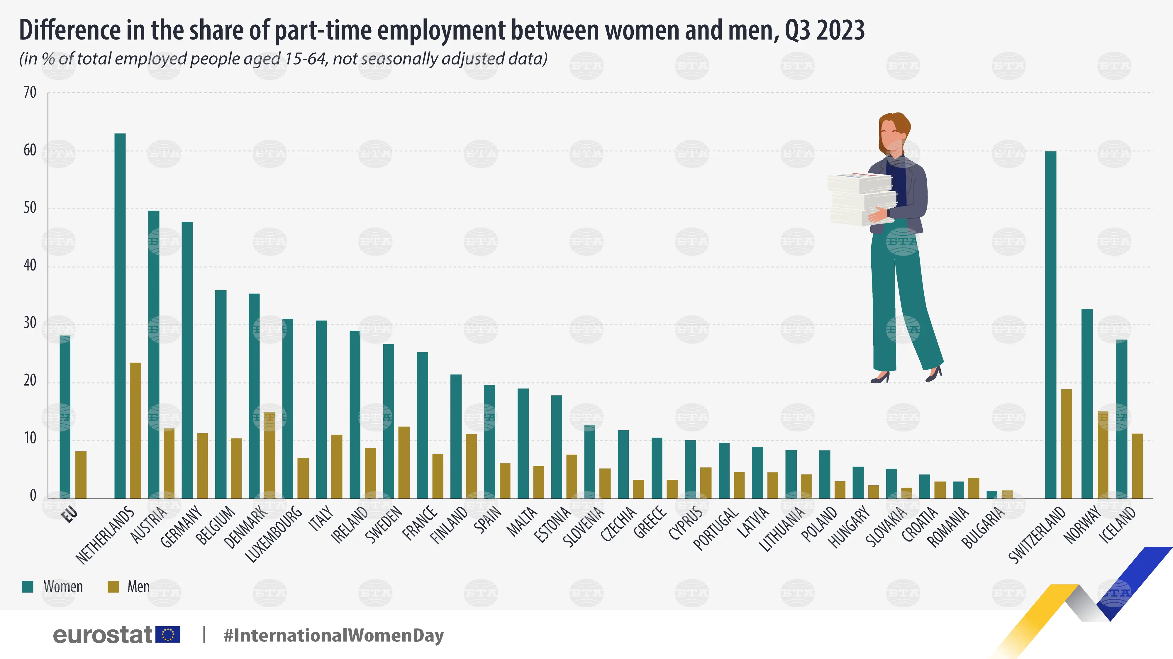 В повечето страни от ЕС жените работят по-често на непълен щат от мъжете. Най-висок е този процент в Нидерландия - 63 на сто спрямо 23 на сто при мъжете, или разлика от 39 процента. Високи разлики са отчетени и в Австрия (38 на сто) и Германия (37 на сто).