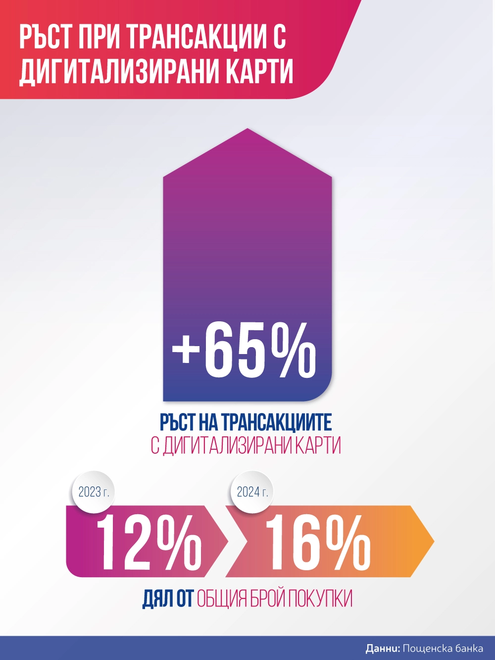 „Наблюдаваме трайно нарастване в предпочитанията на клиентите ни към картови и онлайн разплащания, а също така отчитаме ръст при използването на дигитализирани карти в мобилни портфейли. Всяка 6-та картова трансакция е направена с дигитализирана дебитна или кредитна карта. А всяка 3-та трансакция с дебитна карта през 2024 г. е в интернет. Клиентите ни все повече оценяват удобството, сигурността и допълнителните предимства, които дебитните и кредитните карти предлагат. Показателно е, че за поредна година банката отчита възходяща тенденция при трансакциите с дебитни карти на месечна база, което показва, че клиентите ги разпознават като основно разплащателно средство и все повече ги използват за ежедневните си покупки. Устойчивият ръст в тези сегменти е резултат от нашите постоянни усилия за подобряване на потребителското изживяване“, коментират от Пощенска банка.