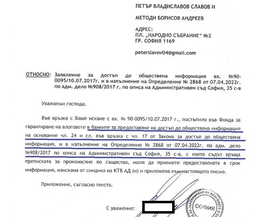 "След пет години съдебни дела успяхме да защитим на обществения интерес – съдът осъди и задължи Фонда за гарантиране на влоговете в банките (който назначава синдиците в КТБ) да признае, че е задължено лице по Закона за достъп до обществена информация и да отговаря на въпроси на гражданите!", съобщава днес на страницата си в социалната мрежа адв. Славов. Той уточнява, че по този начин „Групата за натиск“ е получила данните за събраните средства от синдиците.