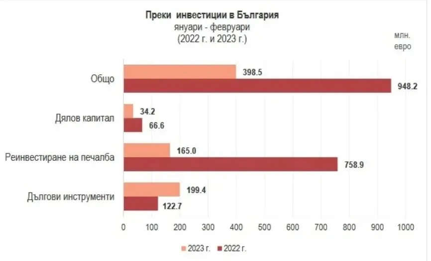 Въпреки това цифрите показват, че са с почти 550 млн. евро или 58% по-малко спрямо преките инвестиции за януари – февруари 2022 г. (положителен поток от 948,2 млн. евро, 1,1 на сто от БВП).