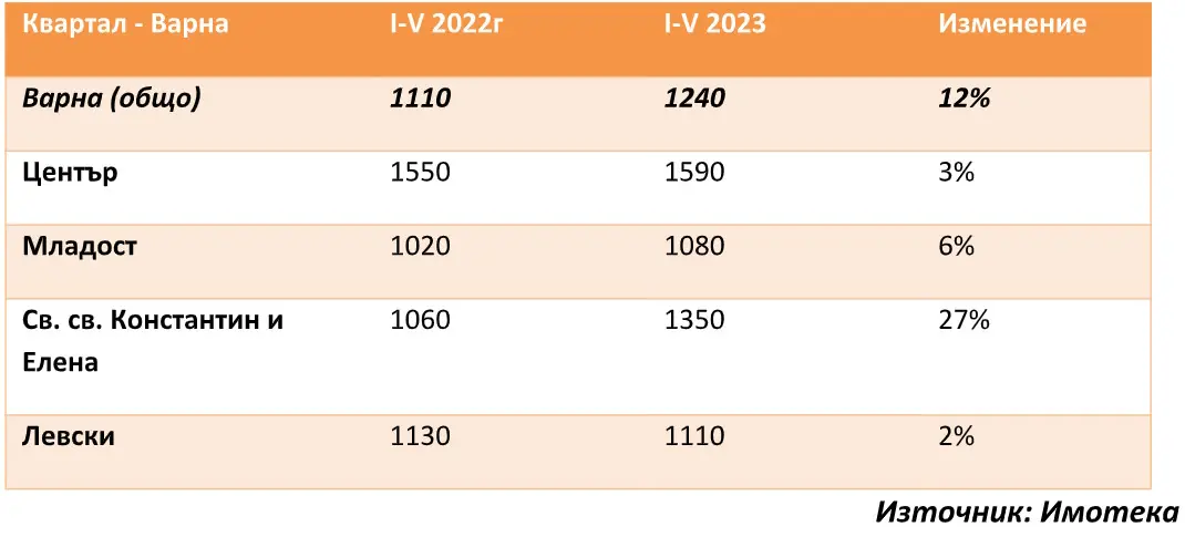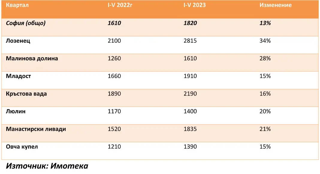 По данни от реални сделки на компанията, ако към юни 2022 година средната цена в София бе достигнала 1 600 евро, то тя днес вече е 1800 евро/ кв. м. Основен катализатор на пазара продължава да бъде новото строителство. Това е и причината за по-сериозните ръстове в Люлин, Манастирски ливади, Овча купел, Кръстова вада, Малинова долина, Банишора, в които има по-наситено предлагане на нови проекти.