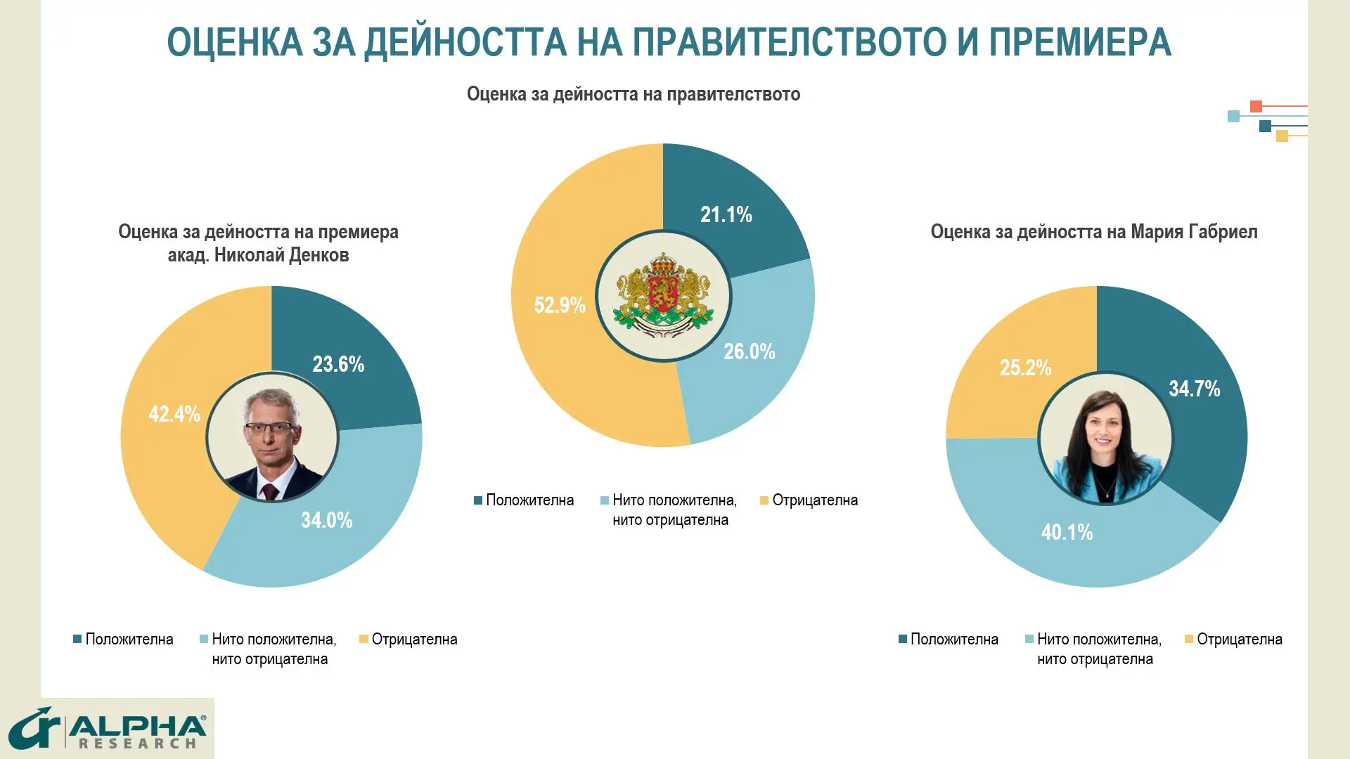 Вицепремиерът Мария Габриел води в положителните оценки пред Николай Денков – тя има 34,7% одобрение на фона на 23,6% за Денков.