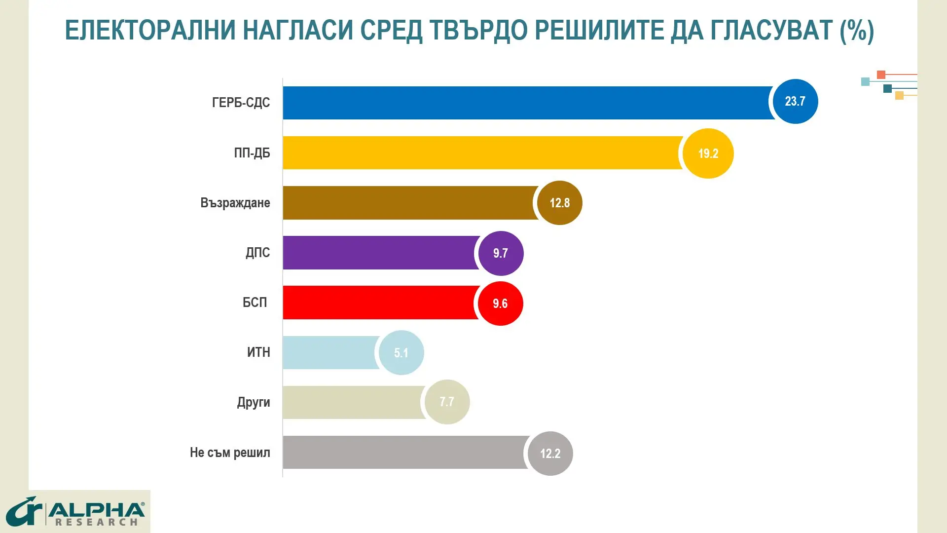 Ако националните избори са днес за ГЕРБ-СДС биха гласували 23.7% от избирателите. Втора политическа сила ще е ПП-ДБ с 19.2% подкрепа. „Възраждане“ ще е трета сила с 12.8%, ДПС - 9.7%, БСП - 9.6%, ИТН - 5.1%. Това сочи ново изследване на „Алфа Рисърч“, проведено в периода 27 февруари – 3 март 2024г. от агенцията. То е реализирано със собствени средства и е проведено сред 1000 пълнолетни граждани от цялата страна.