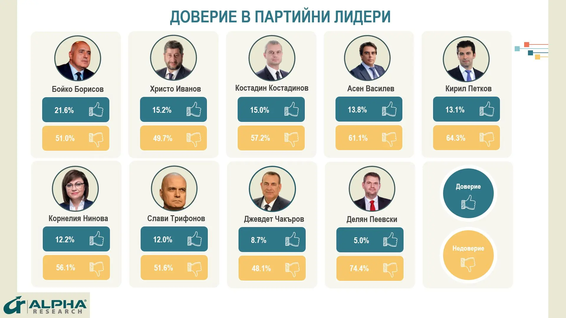 Настоящият премиер пък има най-висока отрицателна оценка – 42,4%. Първенец по доверие сред партийните лидери е Бойко Борисов с 21,6%, следван от Христо Иванов с 15,2%. На трето място е Костадин Костадинов с 15%.