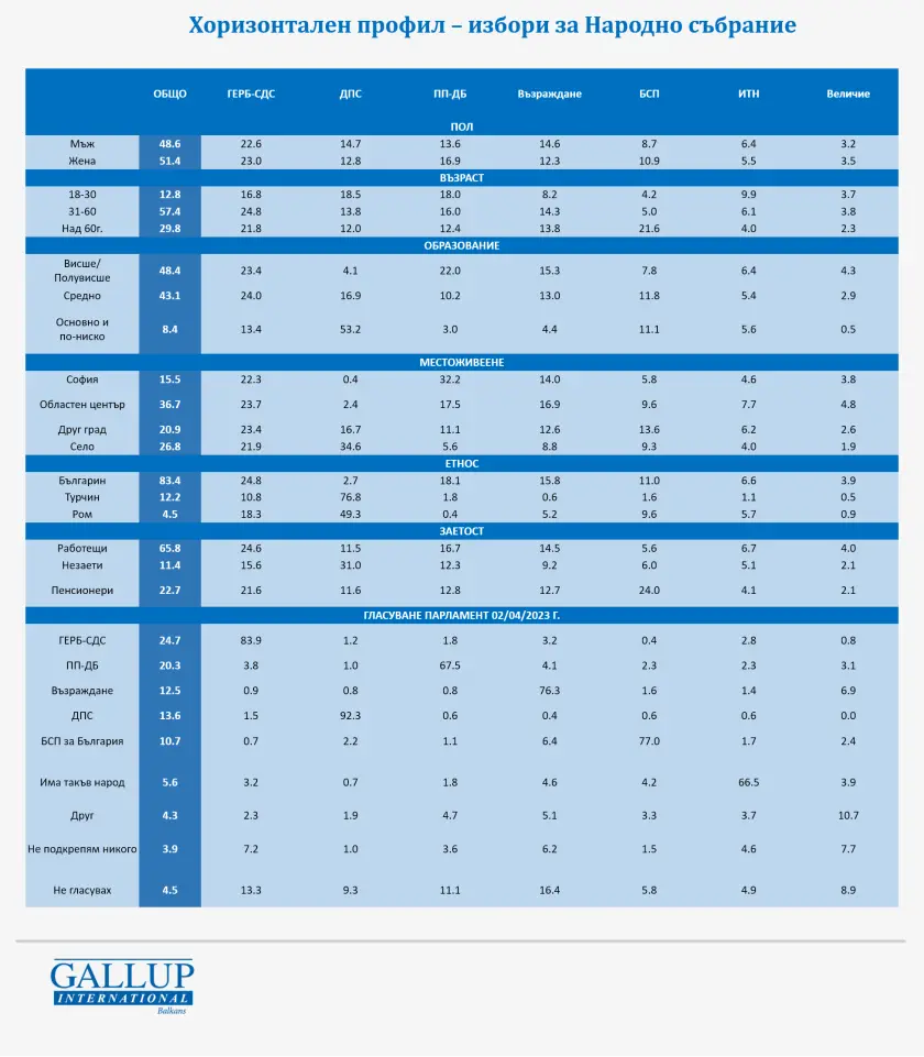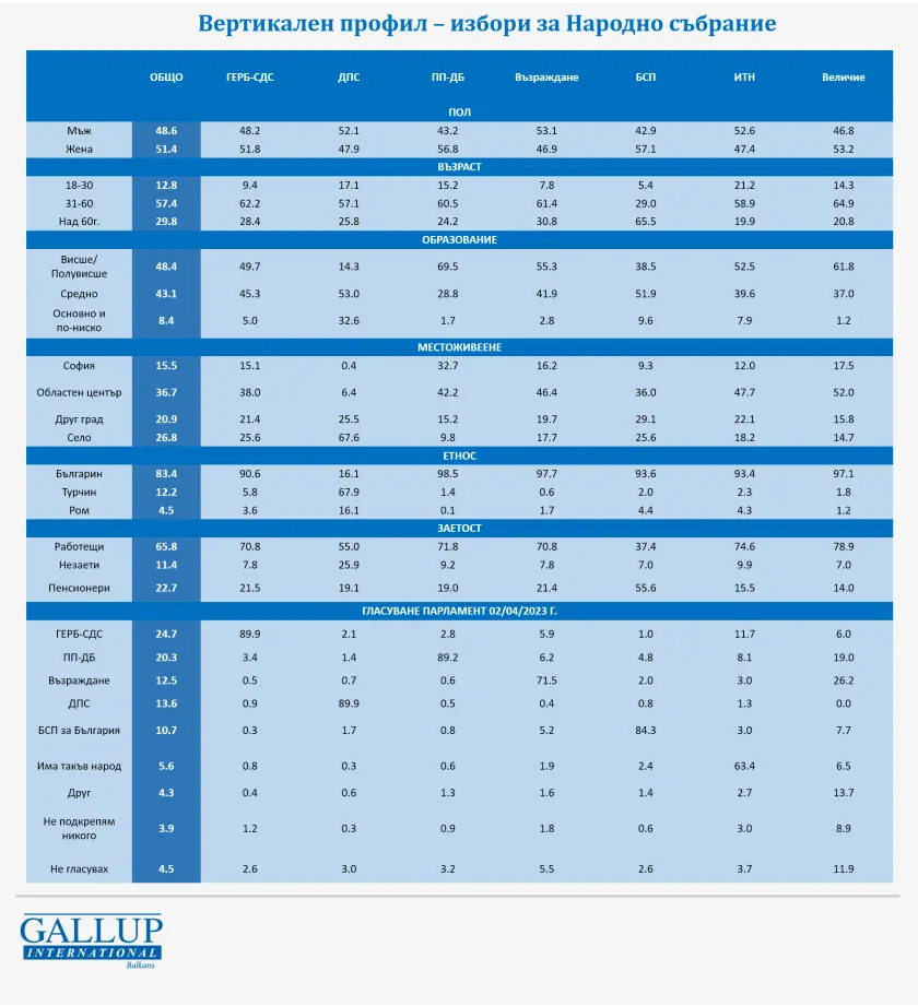 *Таблицата показва структура на електоратите на основните листи – сборовете по вертикали дават 100%.