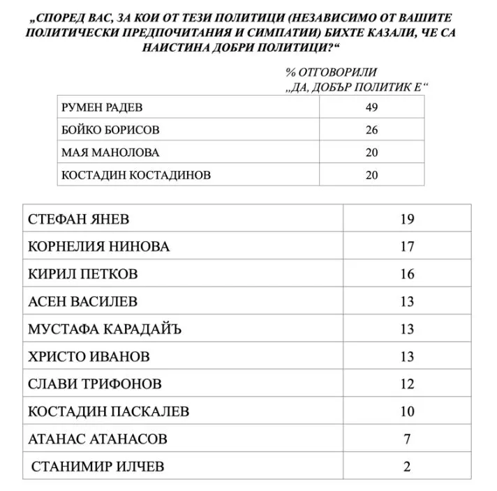 В рейтинга на политиците не се наблюдават значителни размествания. По отношение на личните рейтинги, сред лидерите на партии Бойко Борисов продължава да е на първо място, като покачване бележи и Костадин Костадинов на „Възраджане“. Спад в доверието се наблюдава при Корнелия Нинова и Атанас Атанасов.