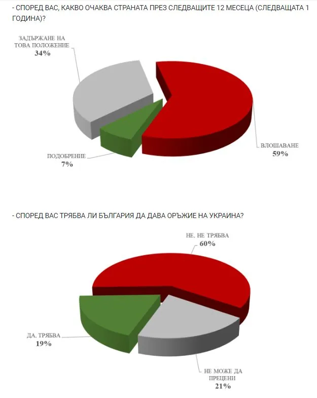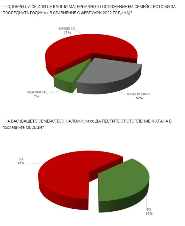 Изследването регистрира подчертан песимизъм породен от удара върху материалния стандарт на живот на голяма част от домакинствата (инфлационната криза от последните месеци). Над 60% отчитат влошаване на материалното си положение в последната година, като мнозинството посочват, че в последните месеци им се налага да пестят от задоволяването на основни потребности – храна и отопление. Това е фонът, на който ще се проектира предизборната борба в следващия месец.