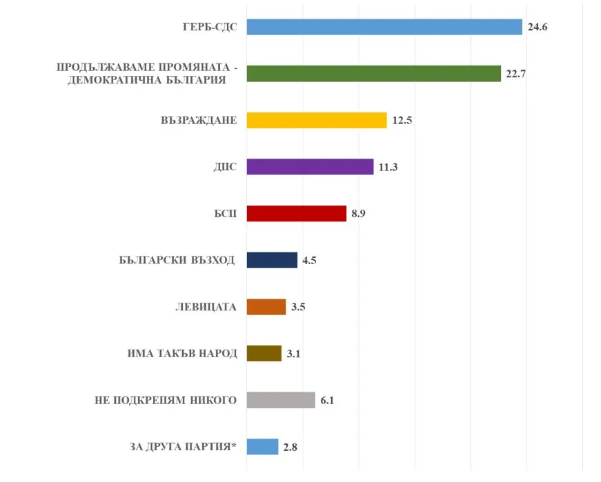 Към момента ГЕРБ води пред коалицията „Продължаваме Промяната – Демократична България“ с около 2 %. Коалицията „Продължаваме Промяната – Демократична България“ засега не успява да консолидира напълно бившите избиратели на двете основни формации участващи в нея, сочи проучване на социологическа агенция „Медиана“.