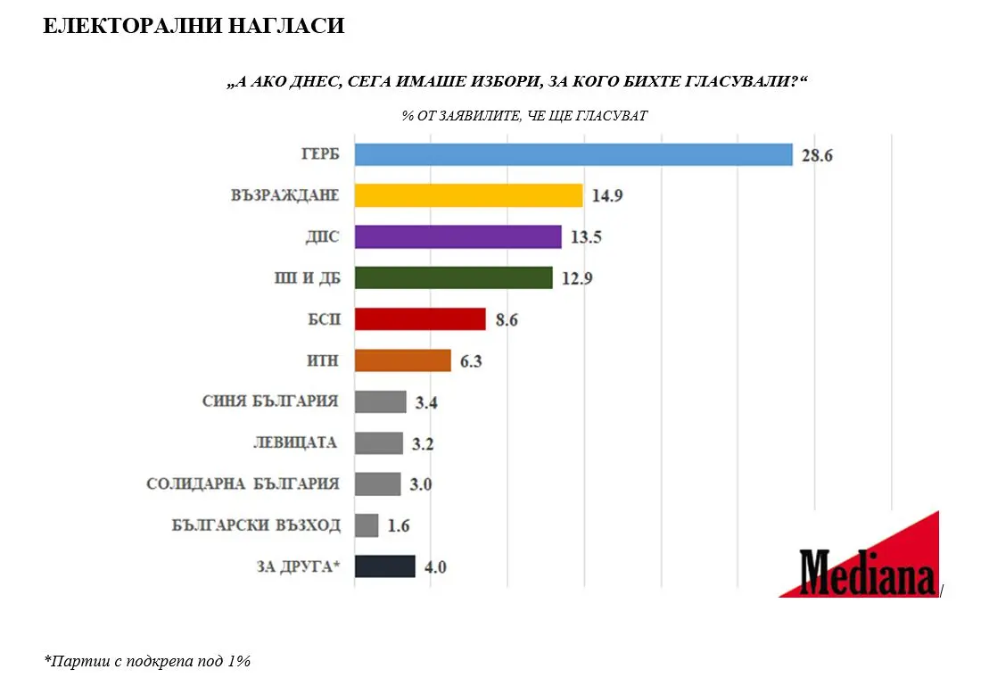 ГЕРБ-СДС води с 14% преднина пред втория "Възраждане", сочи представително прочуване на социологическа агенция "Медиана".