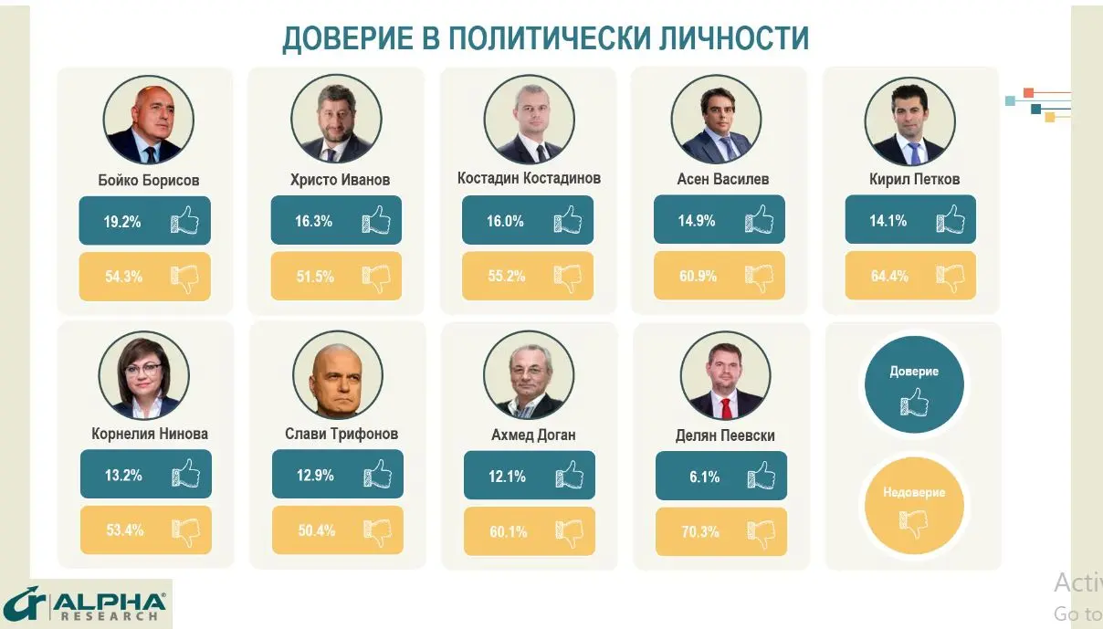 Кабинетът запазва равнището на доверие от месец юни - 21% положителни оценки, но при 46% отрицателни, което е ръст от близо 10 на сто. Малко по-високо е доверието към премиера Денков - 25% положителни при 39% отрицателни оценки, но също с негативен развой. Както премиерът, така и кабинетът са в неизгодната ситуация да се подкрепят само от симпатизантите на ДБ и ПП (между 65% и 70% от тях), но не и от тези на не-коалиционния им партньор ГЕРБ (25% положителни при 39% отрицателни мнения за кабинета).