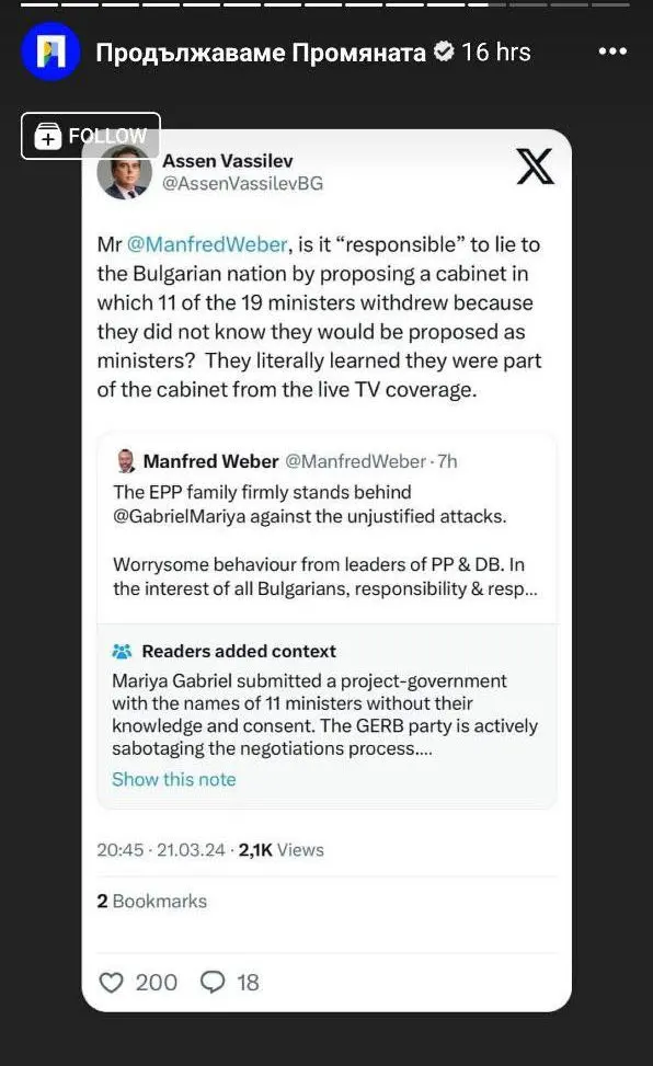 „Г-н Вебер, „отговорно“ ли е да излъжеш българския народ, като предложиш кабинет, в който 11 от 19-те министри се оттеглиха, защото не знаеха, че ще бъдат предложени за министри? Те буквално научиха, че са част от кабинета, от пряко телевизионно излъчване“, ядосва се Василев в социалната мрежа X.